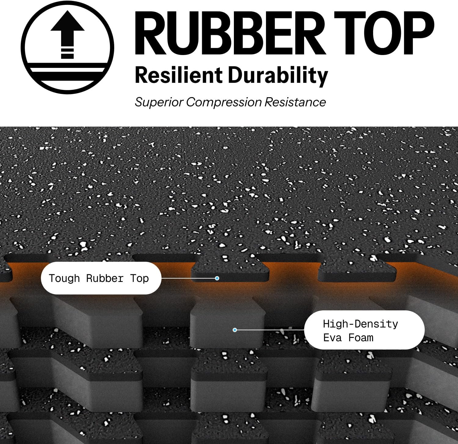 • [Upgraded Dual-Layer Design]: Concerned about your equipment scratching the floor during workouts? Our 2in1 Rubber Top EVA Foam Exercise Gym Mats are crafted to solve this issue. The textured rubber top layer, combined with a high-density EVA foam bottom layer, seamlessly creates a non-slip tough surface with excellent shock absorption.