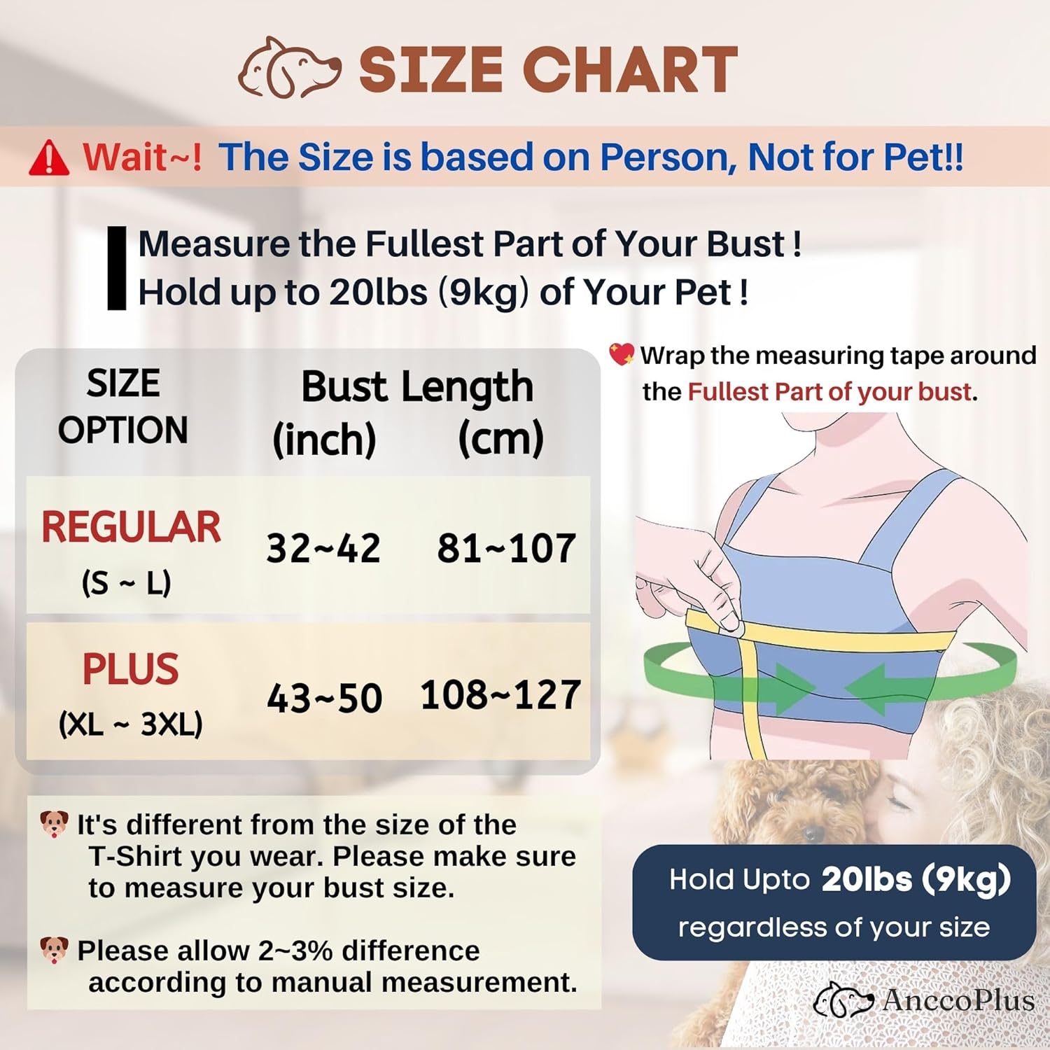 - [SIMPLE SIZE & PERFECT FIT] Please measure your fullest part of your bust and choose your size on the size chart. There are two simple sizes, Regular (S~L) and Plus (XL~3XL). Regardless of your size, our dog carrying sling is designed as small dog carrier up to 20lbs(9kg). The 95% Cotton is extra soft, and the 5% Spandex gives the elasticity which allows our dog sling carrier for small dogs to conform to your pet's shape, ensuring maximum comfort for both you and your pet during use