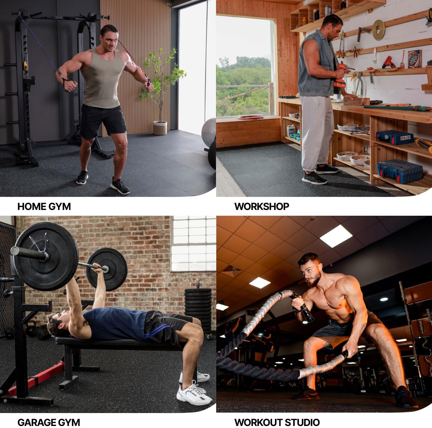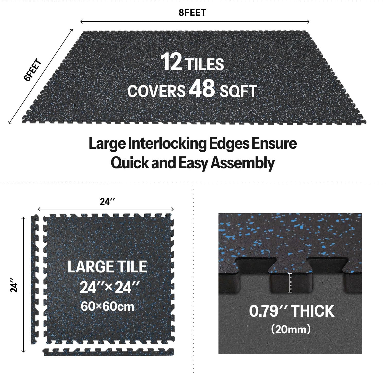 • [Easy to Assemble and Detach]: 12 tiles (24" x 24" x 0.79" each), covers 48 sq ft (8 ร— 6 ft). Upgraded larger interlocking locks provide a secure fit, preventing any separation during use, ensuring you can work out without concerns of shifting. Simple assembly and detachment make it effortless to set up your home gym.