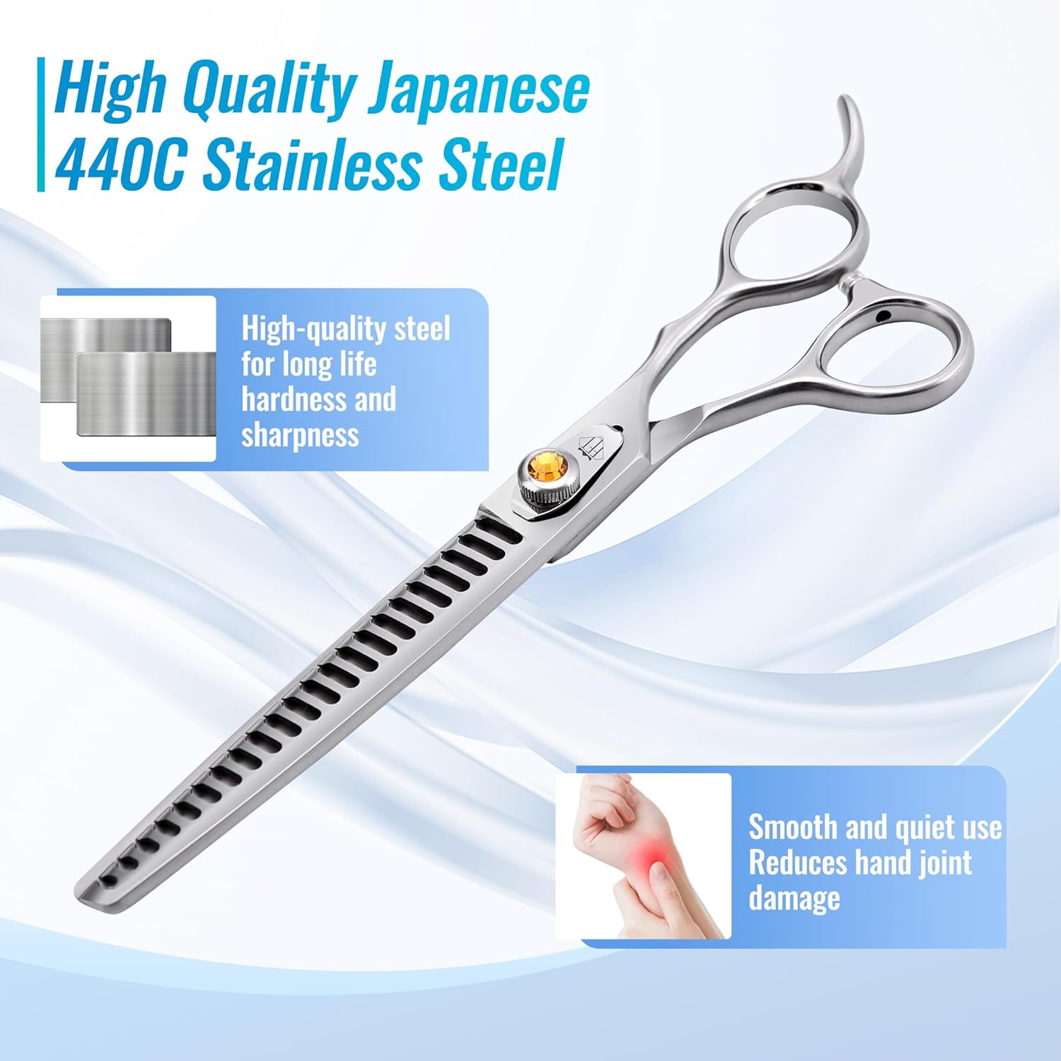 • Features: These pet chunker scissors are 7.5 inches long with ergonomic handles that fit most people. Fine polished brushed surface with delicate metal texture. Precise adjustable screws effectively prevent the screws from loosening due to prolonged use.