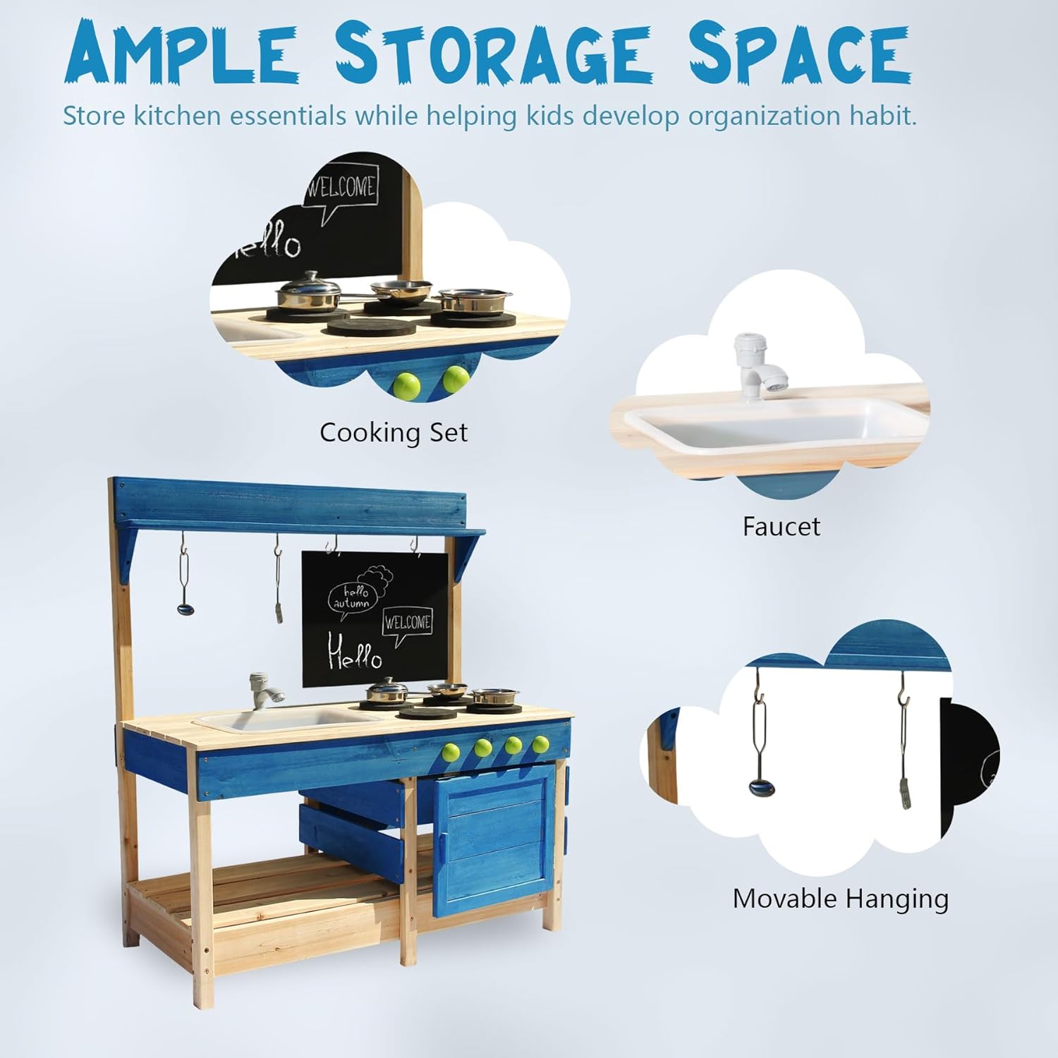 Mud Kitchen Playset for, Outdoor Wooden Toy Play Kitchen Set for Boys and Girls, Kitchen Accessories and Garden Sink with Faucet, Blackboard, Cookware Pot (Blue)