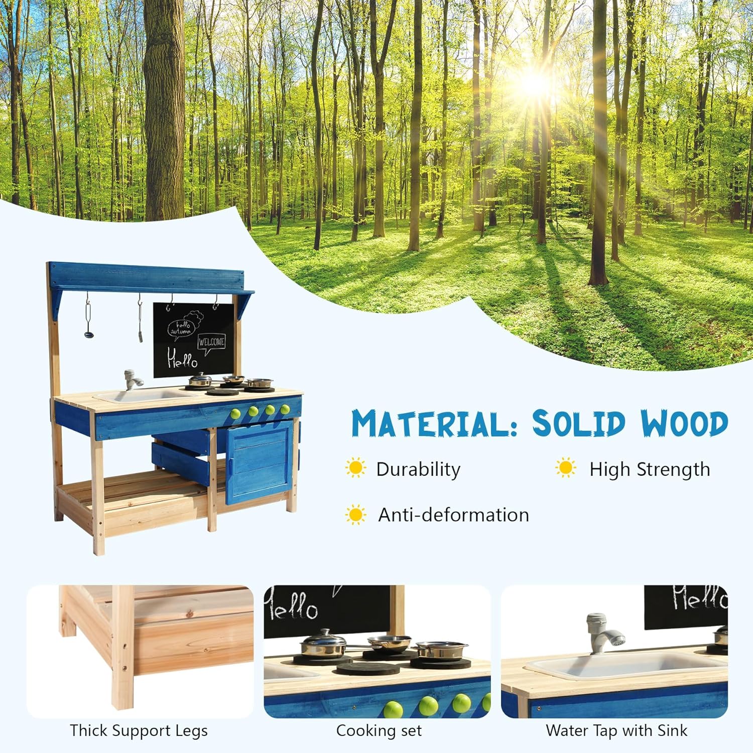 • Solid Pine Wood Material: Crafted from high-quality pine wood, our outdoor mud kitchen ensures durability and safety. Designed for toddlers aged 3 and above, it provides a secure and worry-free play environment.