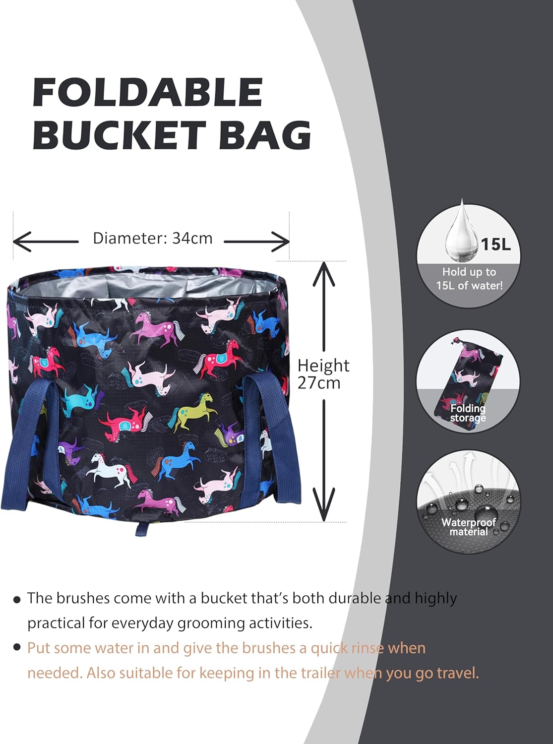 • Portable Water Bucket: The horse grooming set comes with a foldable tote bag that not only neatly stores all the brushes but also doubles as a mobile water bucket. This convenient feature allows for quick cleaning of brushes or your horse, eliminating the need to carry a separate bucket for on-the-go grooming.