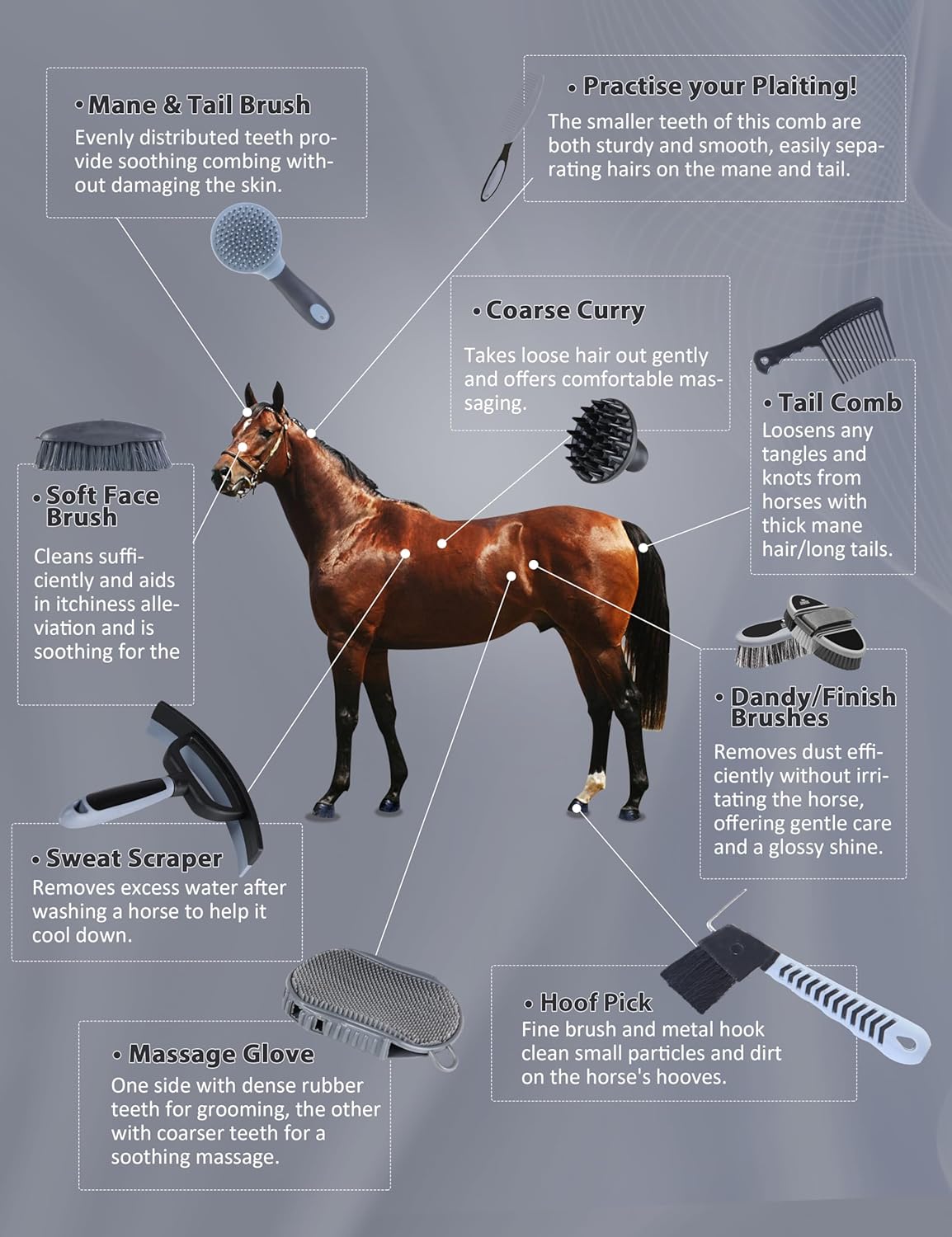 • Durable & Long-Lasting: Made from high-quality materials, the brush set features premium plastic construction with special wear-resistant treatment, ensuring exceptional durability that far surpasses ordinary brushes. These horse brushes effectively remove dirt from the horseโ€™s coat, stimulate blood circulation, and promote natural oil production for a smooth, glossy coat.