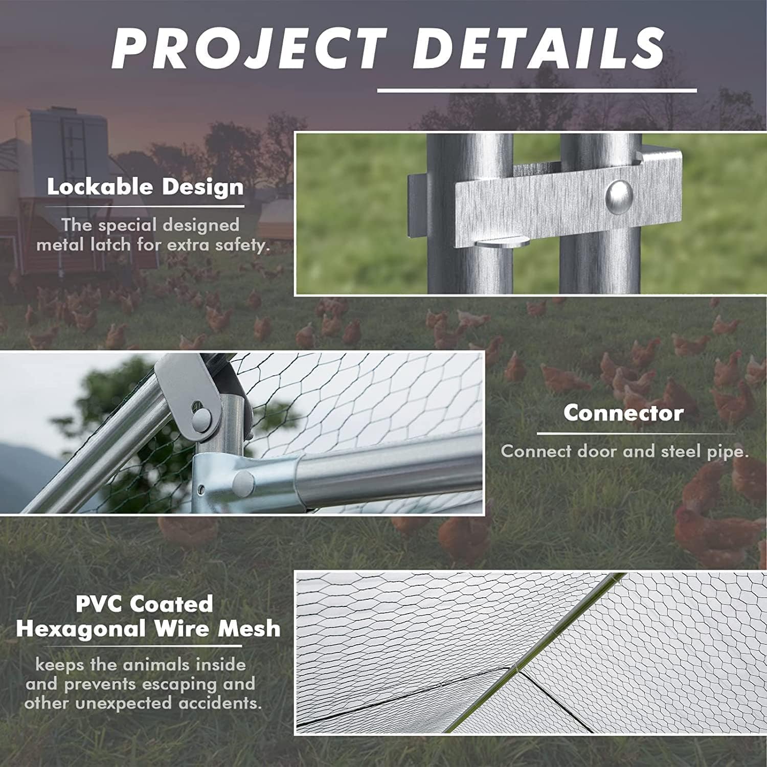 • Durable Steel Chicken run house: The chicken coop uses a durable steel pipe frame, coupled with galvanizing technology, don't worry about rusting in outdoor. The steel pipe diameter reaches 0.98 inches, which is strong and stable enough in windy and rain