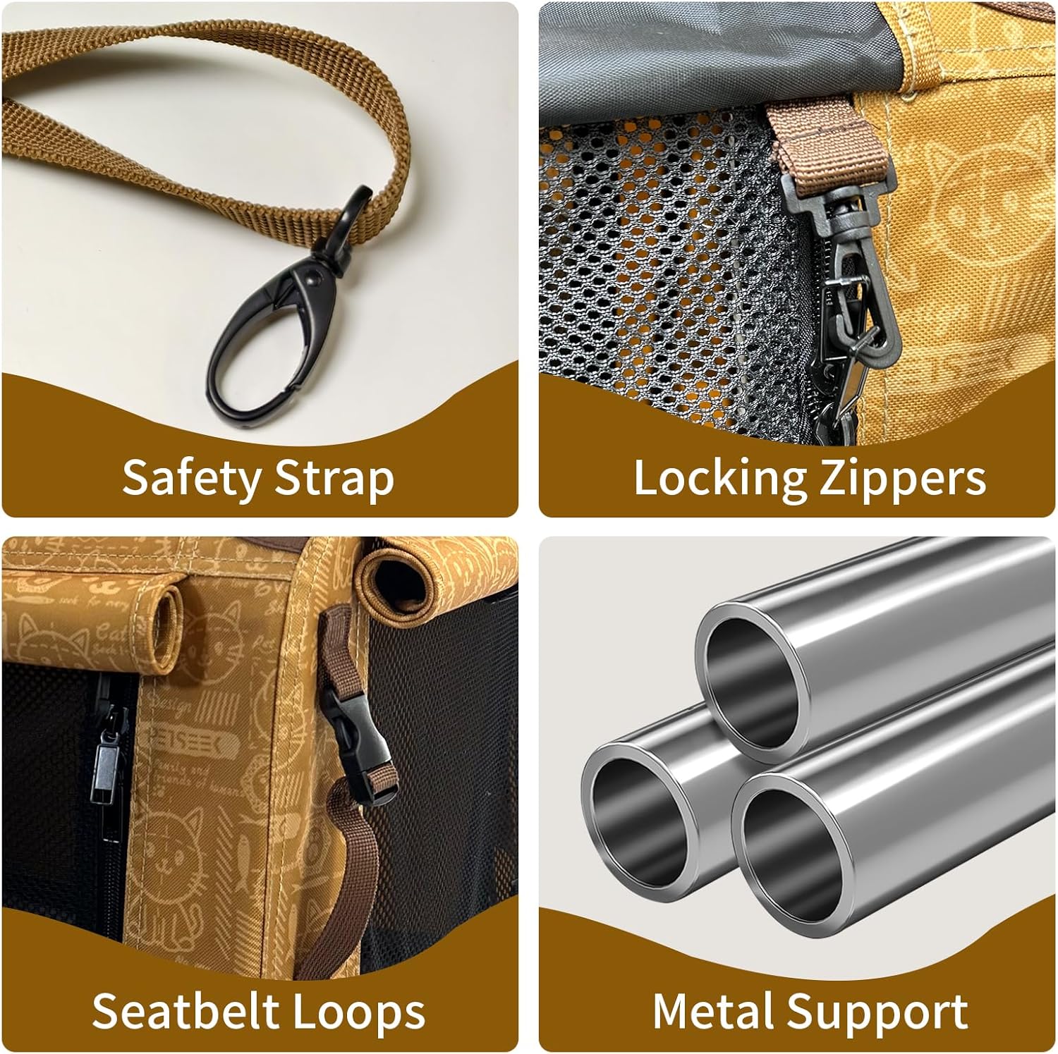 • SAFETY DESIGN- Each access has a zipper lock to prevent cats from escaping. On the side have seatbelt loops, can fix the carrier in the car. The internal metal support structure may also provide good protection for pets.