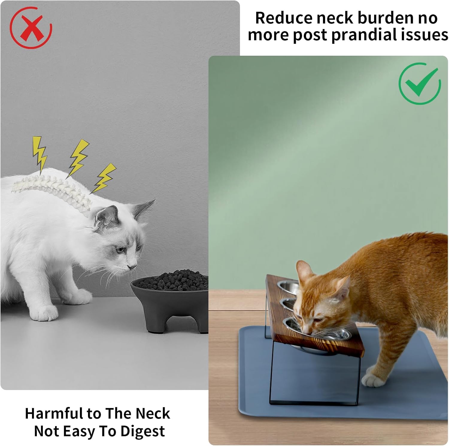 Upgraded Elevated Cat Bowls with Food Mat,15°Tilted Stand Anti Vomiting Raised Cat Dishes for Food and Water,3 Stainless Steel Bowls for Cats and Puppy(Rustic Brown)