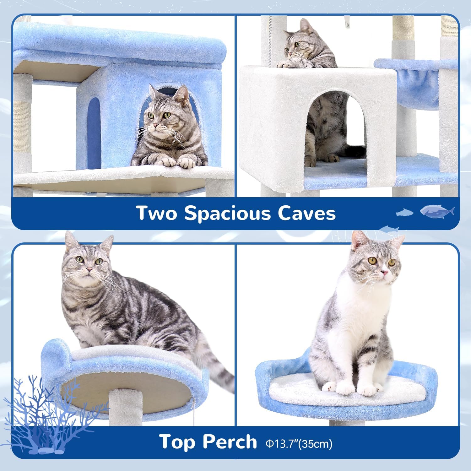 • 2 CAT CAVES, 2 Styles - Equipped with two cat condos. The large cat condo provides cats with a private resting space. The high-level condo serves as a 'lookout' tower, allowing discreet observation of the surroundings.