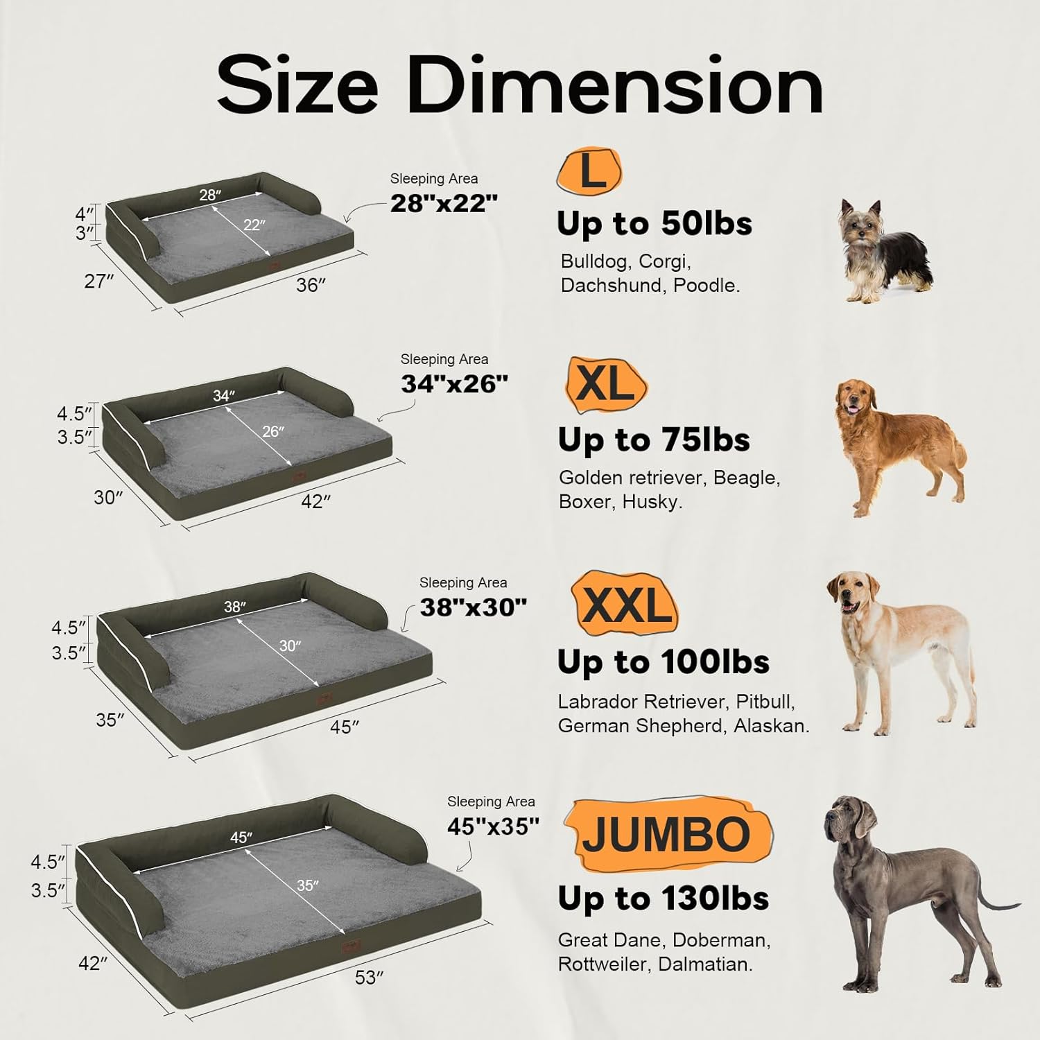 Large Dog Bed Orthopedic Washable - Beds Bolster Pet - XL Large Big Dogs - Memory Foam - Couch Sofa Bed- Waterproof with Removable Cover - Dark Green Dog Bed