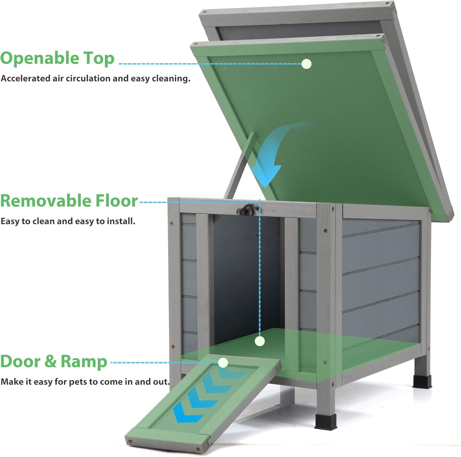 • Pet Friendly Design: The door can also be used as a ramp, ideal for small animals to access the rabbit shelter, providing them with a safe place to rest and sleep. The roof can also be opened to allow pets to breathe and sunbathe.