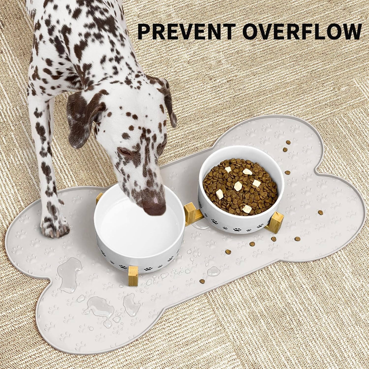 • Raised Edge - The high edge of this feeder mat keeps food and water within the tray and prevents spillage onto a clean floor. Keep your living space tidy and clean, say goodbye to messy floors, you just need to clean the dog bowl mat regularly.