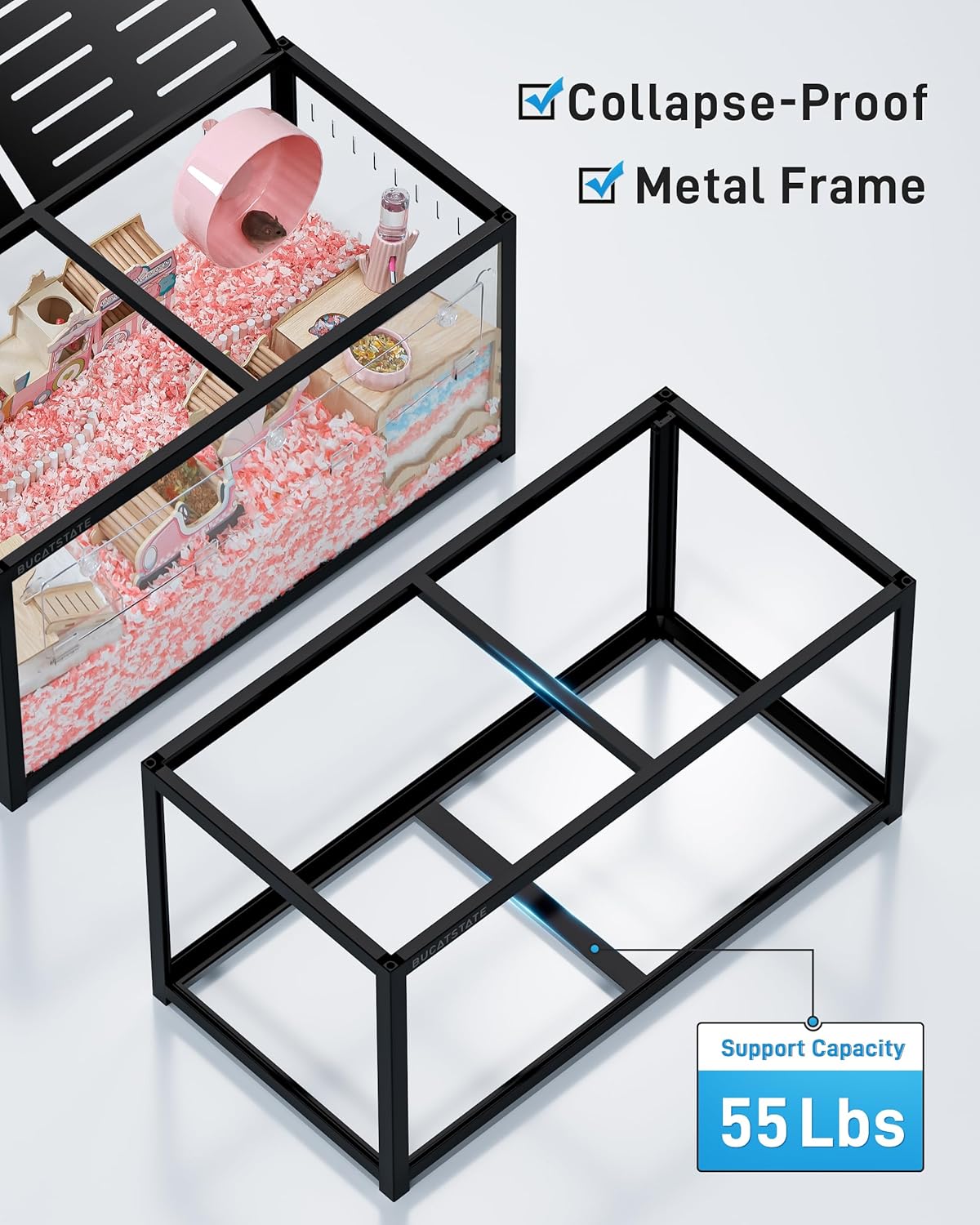 • 【Chew-proof & Sturdy Hamster Tank】Made with thickened clear acrylic panels and a chew-proof metal frame, this dwarf hamster cage is perfect for keeping your little escape artist safe. Four clear-view windows allow you to easily spot your pet at any time.