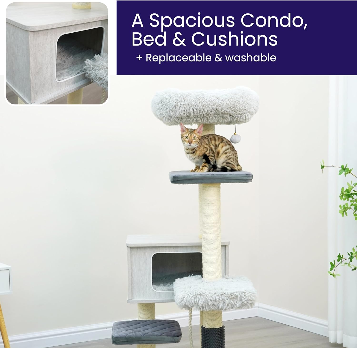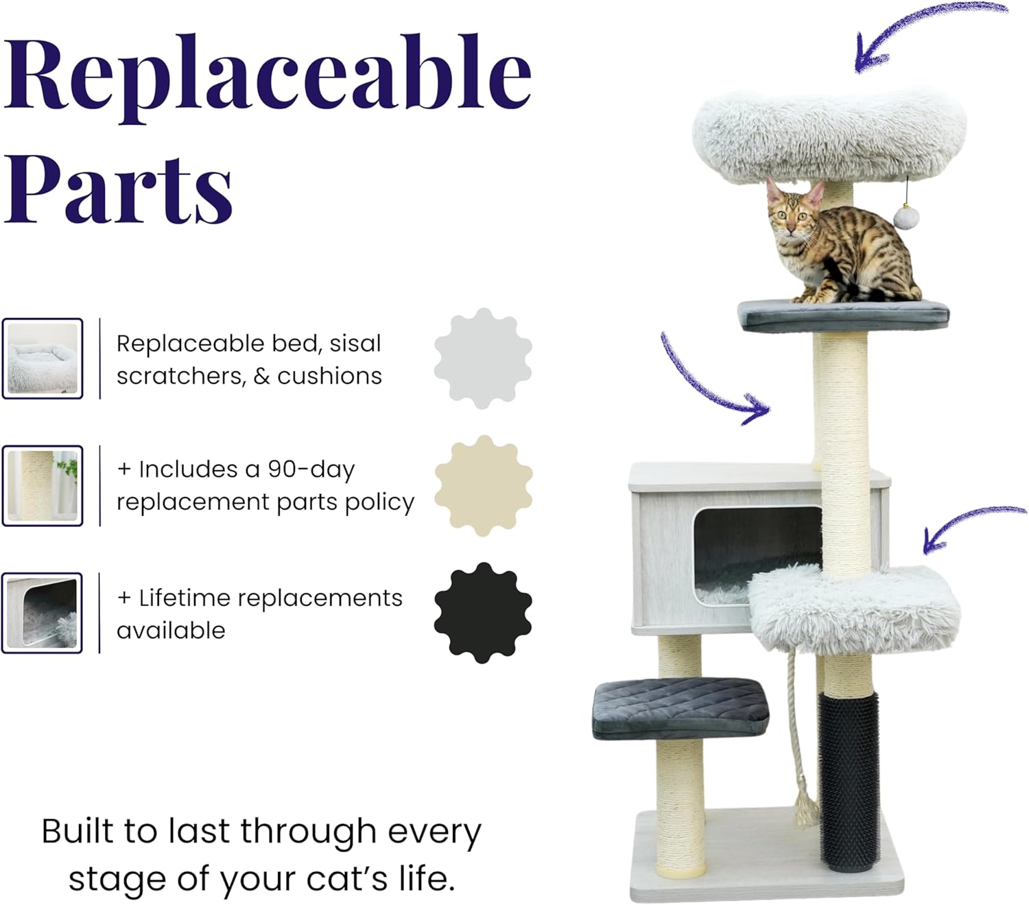 • Replaceable natural sisal scratching posts and beds.
