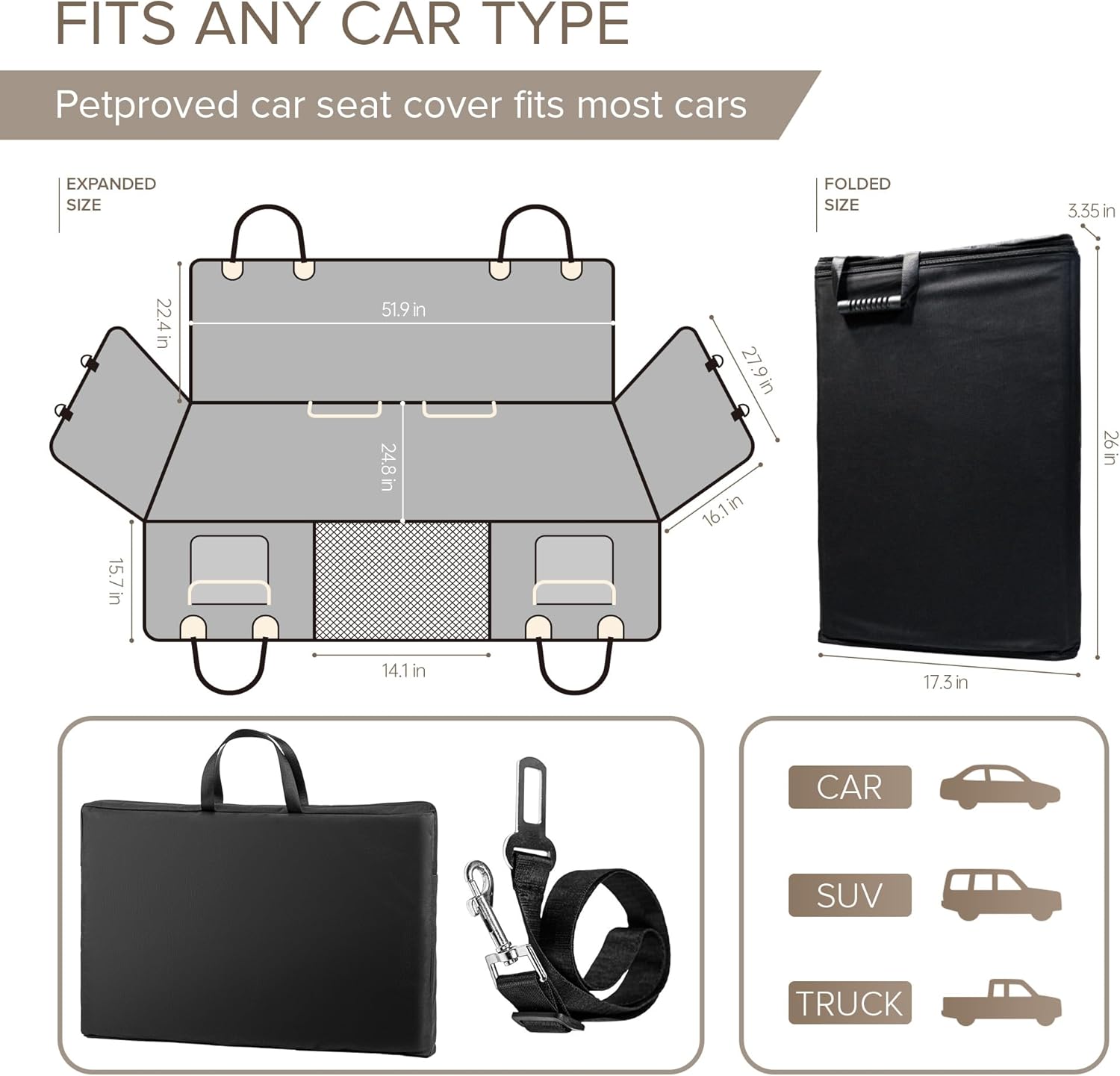 - FIT FOR ALL VEHICLE TYPES - Back seat protector for dog sized 63x52 inches that designed to effortlessly accommodate a wide range of vehicles. Whether family car, SUV, or pickup truck, this large dog car seat will fit well and provide the protection your vehicle needs. Universal rear seat cover is foldable, ensures quality and convenience, back seat extender for dogs keep car clean and secure. This pet car seat cover is perfect dog accessories and dog car seat for large dogs for all your journey