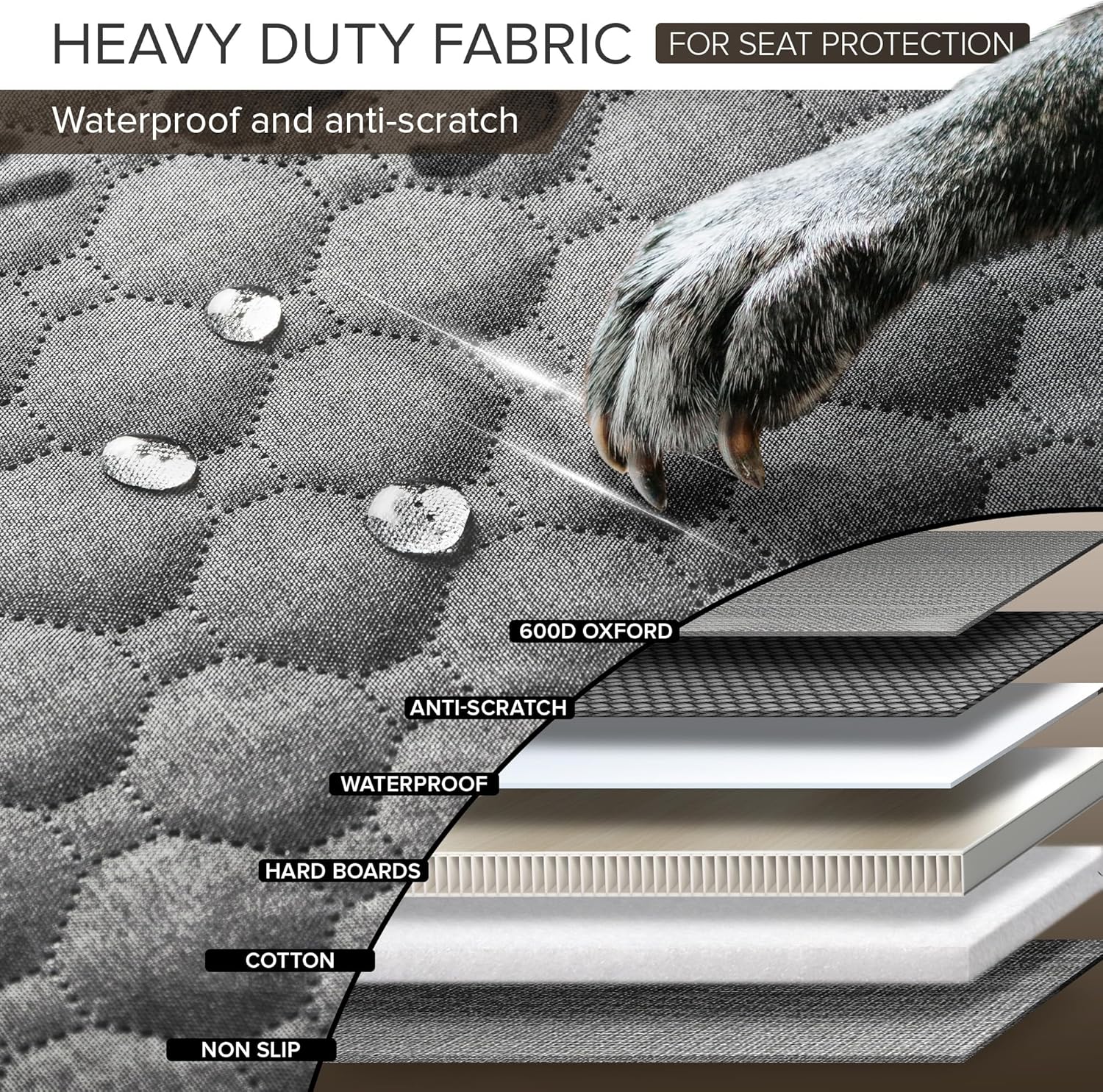 - HEAVY DUTY DOG CAR BED TO ALL-ROUND PROTECTION - The waterproof back seat cover made of 6-layer fabrics, including strong 600D Oxford, dog car seat cover hard bottom and special fabric for scratch-resistant, safeguarding car seats from wear, water and stains. Backseat cover for dogs in car with extra higher door protector avoid doors from scratches and damage. Let dogs hop in and out the dog hammock bed with joy, while car seat covers for dogs takes care of preserving your car perfectly