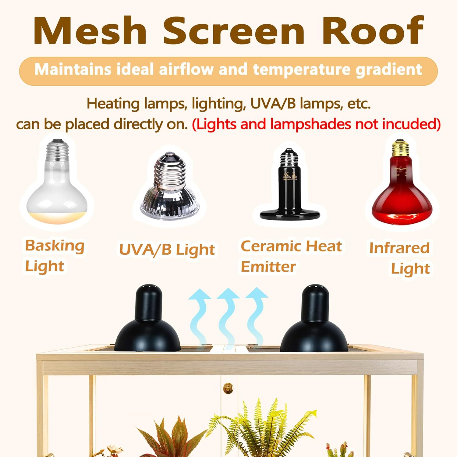 • 【Functional Elegance】Designed with functionality in mind, our reptile terrarium features double sliding front doors that can be effortlessly opened or secured with a lock to prevent escape attempts. The top is fitted with sturdy metal mesh, allowing for proper ventilation and accommodating the direct placement of heat lamps and UVA/B lights (not included) to ensure optimal temperature regulation.