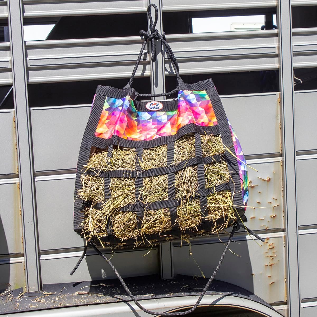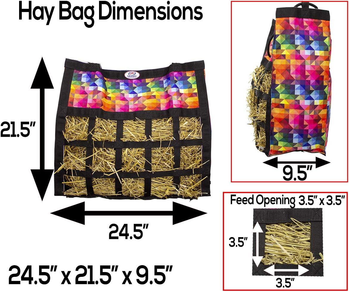 • HOLDS 2-3 FLAKES OF HAY - this 24.5"x9.5"x21.5โ€ hay bag with 3.5" square openings holds approx. 2-3 flakes of Timothy, Orchard, Alfalfa, or any other type of hay. Our hay bags were designed to minimize frustration and can be stuffed in seconds.