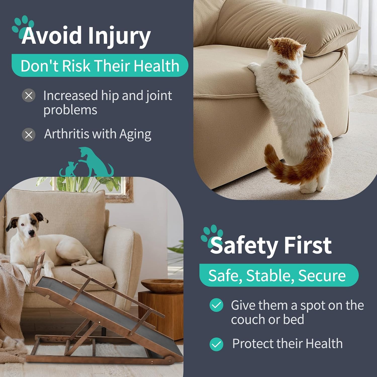 • STURDY & DURABLE: Our pet ramp for dogs and cats is specially made very well - solid wood construction and sturdy stainless steel fasteners, which has been tested to support up to 200lbs. When they jump off the bed, sofa, and sofa, there is no need to worry about getting injured, which provides safety for your pet.