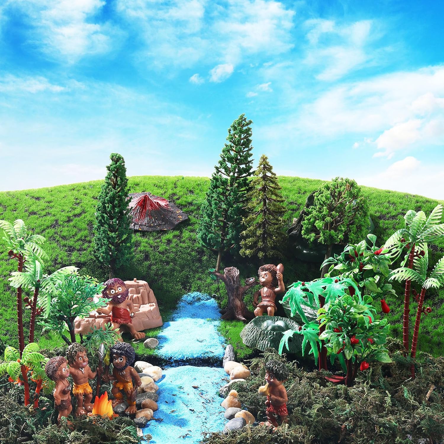 • Prehistoric Man Diorama Supplies: package includes 6 miniature people figurines, 7 different types of tree stump volcano lamp accessories, 11 Mixed Model Trees or plastic trees, 1 bag of blue sand, 1 bag of stones and 1 bag of 50g green moss; Nice combination to meet your needs, very suitable for building a primitive theme school project