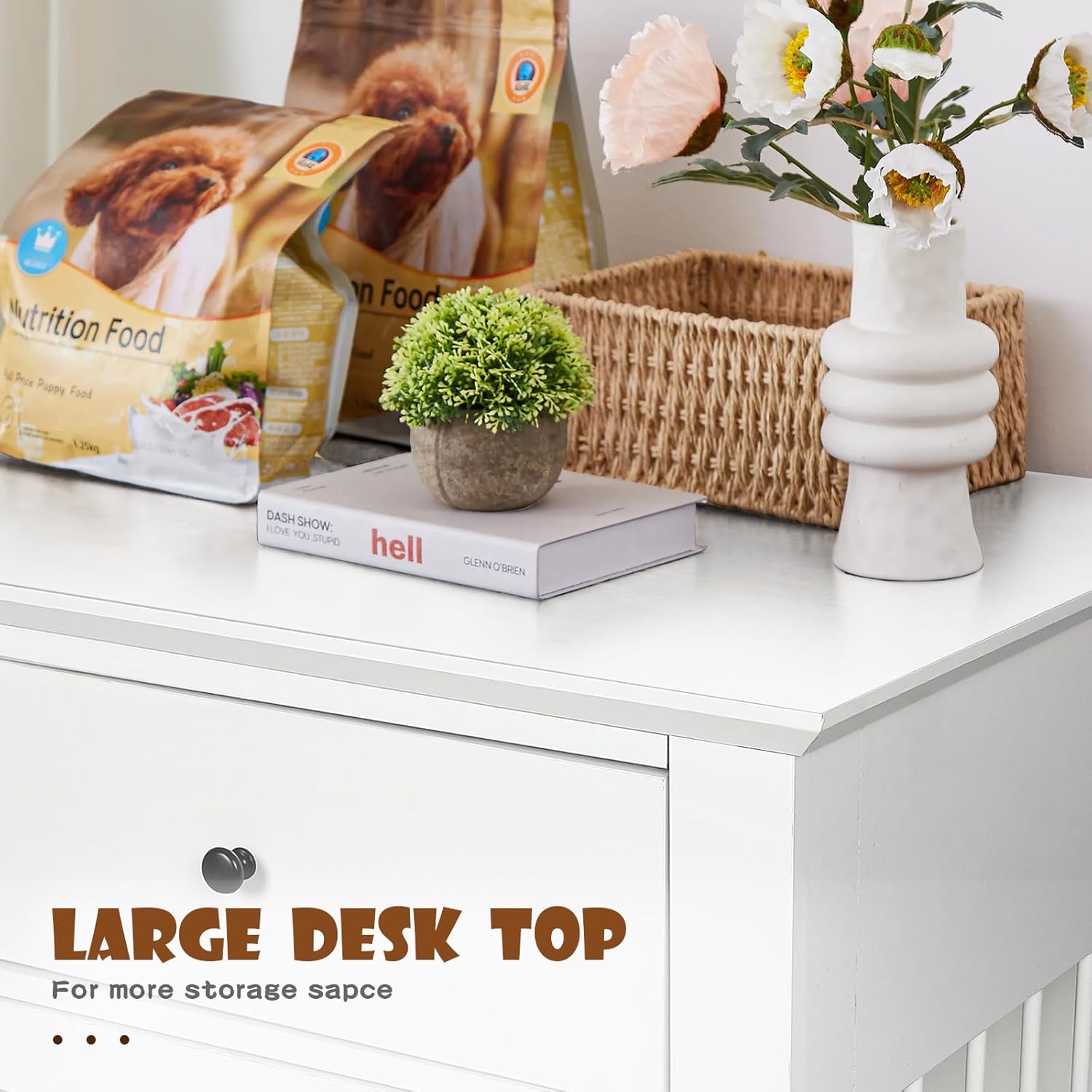 • Large Table Top & Storage Drawer: The top panel of the dog cage is large and sturdy, and can hold up to 150 lbs, perfect for displaying home decorations such as plants, magazines, and family photo frames. And below the countertop are two large drawers, you can store dog food, snacks, toys, etc. Under the drawers is the exclusive space for the dog