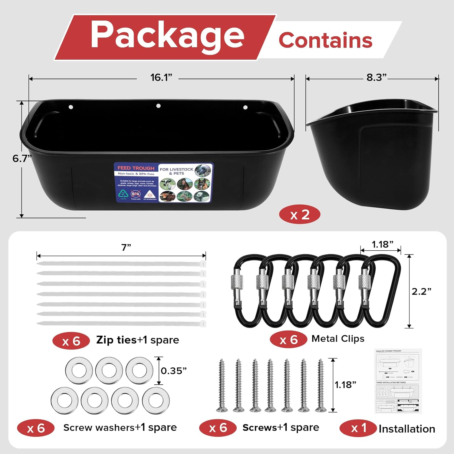 • 【9 Quart Large Capacity】Our 2 pack feeding trough is also watering trough which can hold up to 9 quarts of feed and water. On the one hand, the large capacity eliminates the need to add feed and water frequently, and on the other hand, can let a group of small animals to feed and drink at the same time. Makes feeding more organized and less chaotic.