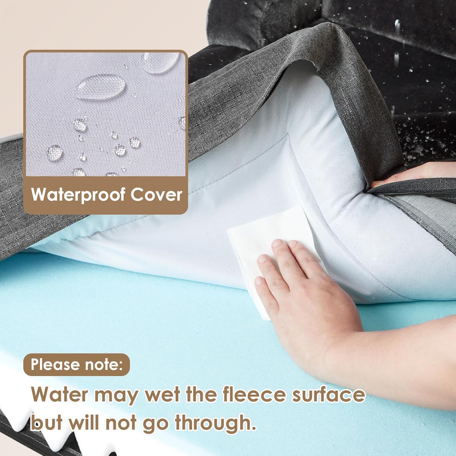 • WATERPROOF FILM and NON-SLIP BOTTOM: There is a waterproof film between the fleece surface and the bottom fabric that makes the dog bed waterproof. However, the faux linen on the side is not waterproof. A non-slip point on the bottom is not easy to slide, and keeps your dog bed steady.