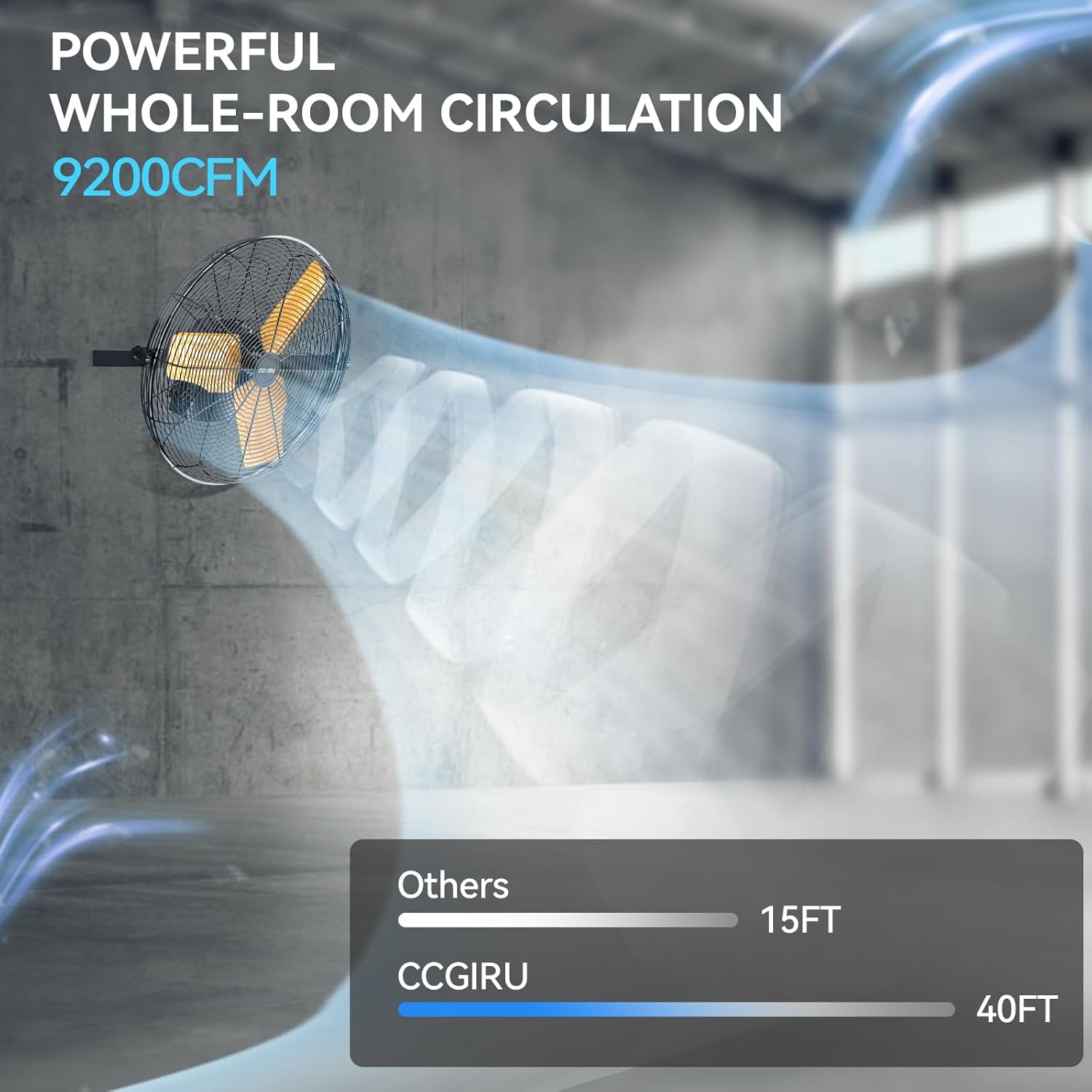 • Much Longer Airflow Movement: Due to the new tech, CCGIRU's heavy duty industrial fan delivers longer circulating breeze for large spaces, the blowing distance reach to 40 ft in high speed. Great for industrial, commercial, garage, warehouse, workshop, and Barn