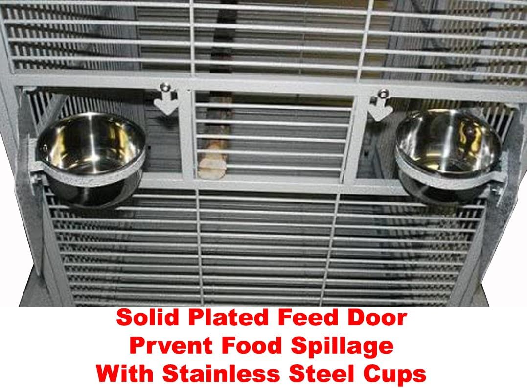 • 【Large Front Swing-Out door】(Size 12" x 34"H) with metal safety lock;【Four Stainless Steel Feeder Cups】 With Swivel Solid Metal feeder doors prevent spillage, Inside With Wooden Stand Perch. One Top Breeding Door Included.