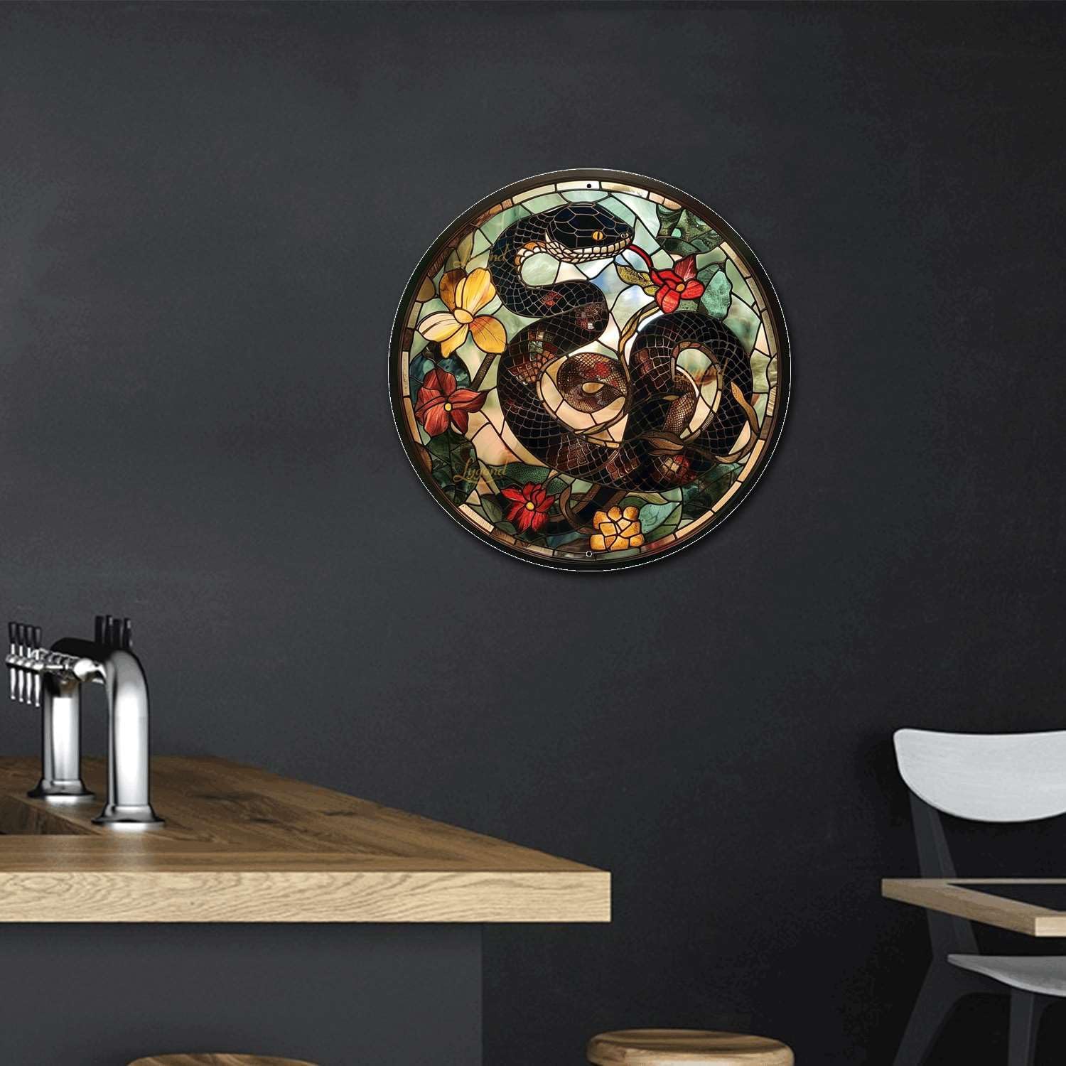 Lygond Metal Tin Sign - Circular Stained Glass Snake Vintage Sign for Garden - 8x8 Inches