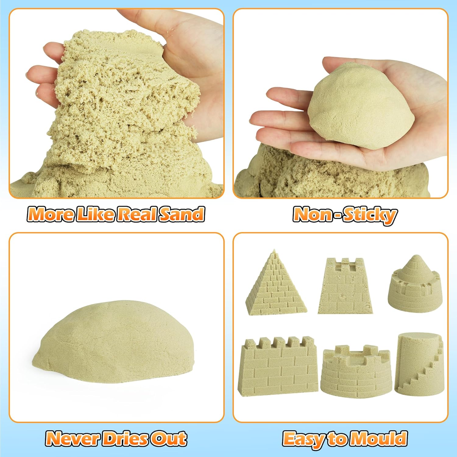 • Premium Sensory Sand Kit: The magical sand has the texture and fluidity of ordinary sand, easy to shaped, non-sticky and not dry. Children can build their own castles by grabbing, pinching and kneading the sand, unleash their creativity in sand art!