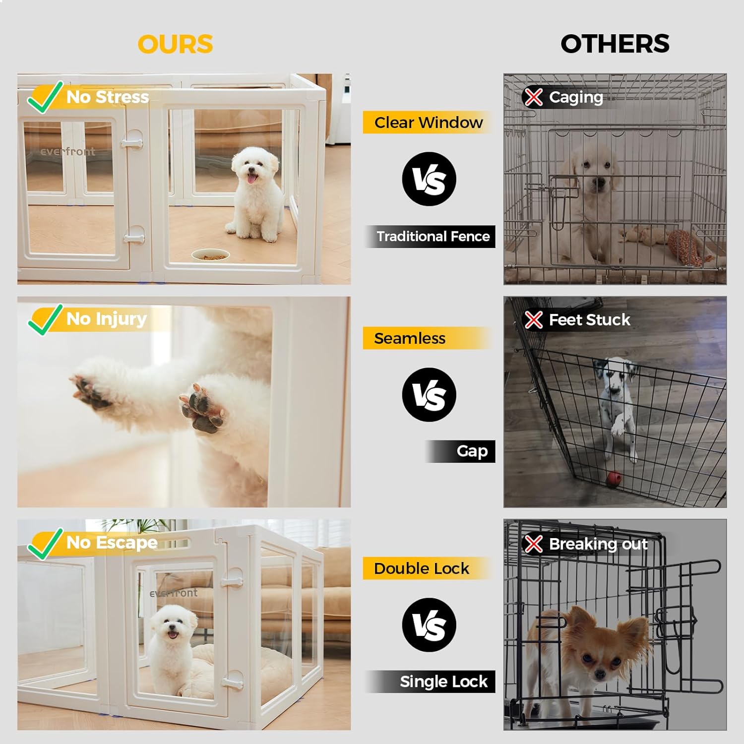 • Clear View, Less Stress - Everfront clear acrylic plastic dog playpen adopts all-new clear view design by using transparent acrylic panels, which allows you to observe your pet at all times, and significantly reduces stress of pet comparing to dog fence type kennel as if being caged.
