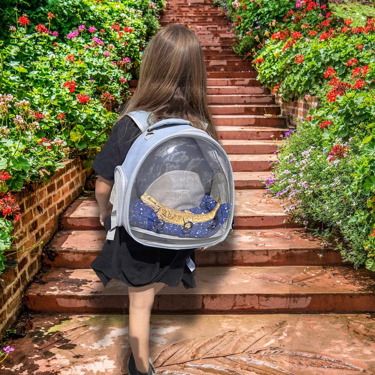 • The bearded dragon portable carrier backpack with leash is vented and breathable, crafted with breathable materials,side open window and pocket are made of anti-scratch mesh materials. 5 vents around the bubble carrier backpack,ensure sufficient air flow and allows lizard to breathe inside better.