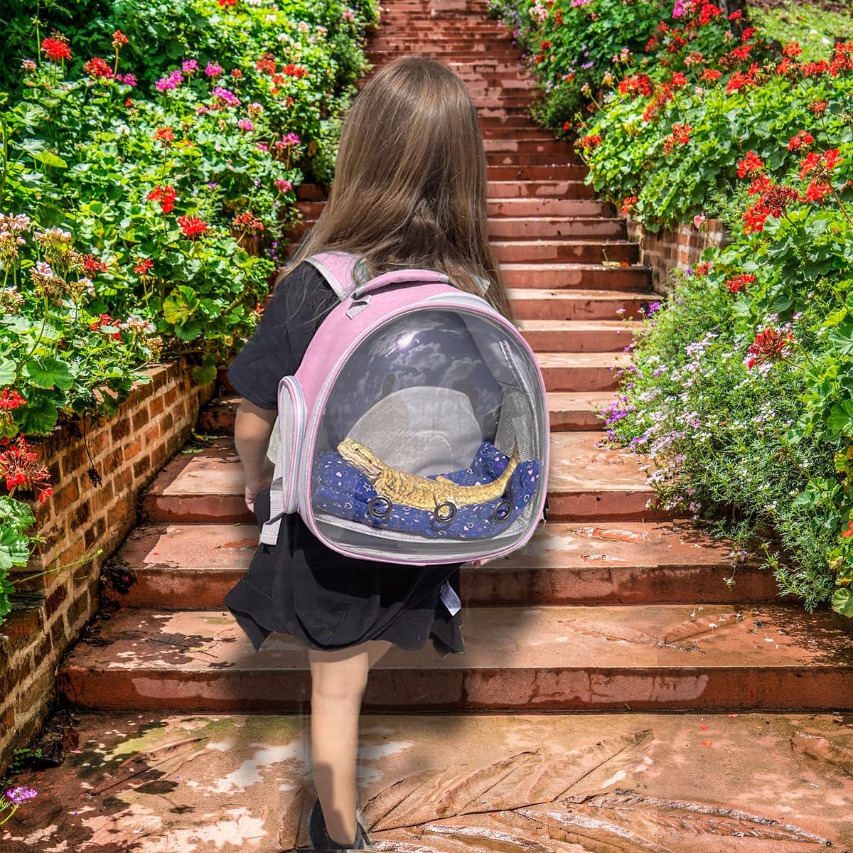 • The bearded dragon portable carrier backpack with leash is vented and breathable, crafted with breathable materials,side open window and pocket are made of anti-scratch mesh materials. 5 vents around the bubble carrier backpack,ensure sufficient air flow and allows lizard to breathe inside better.