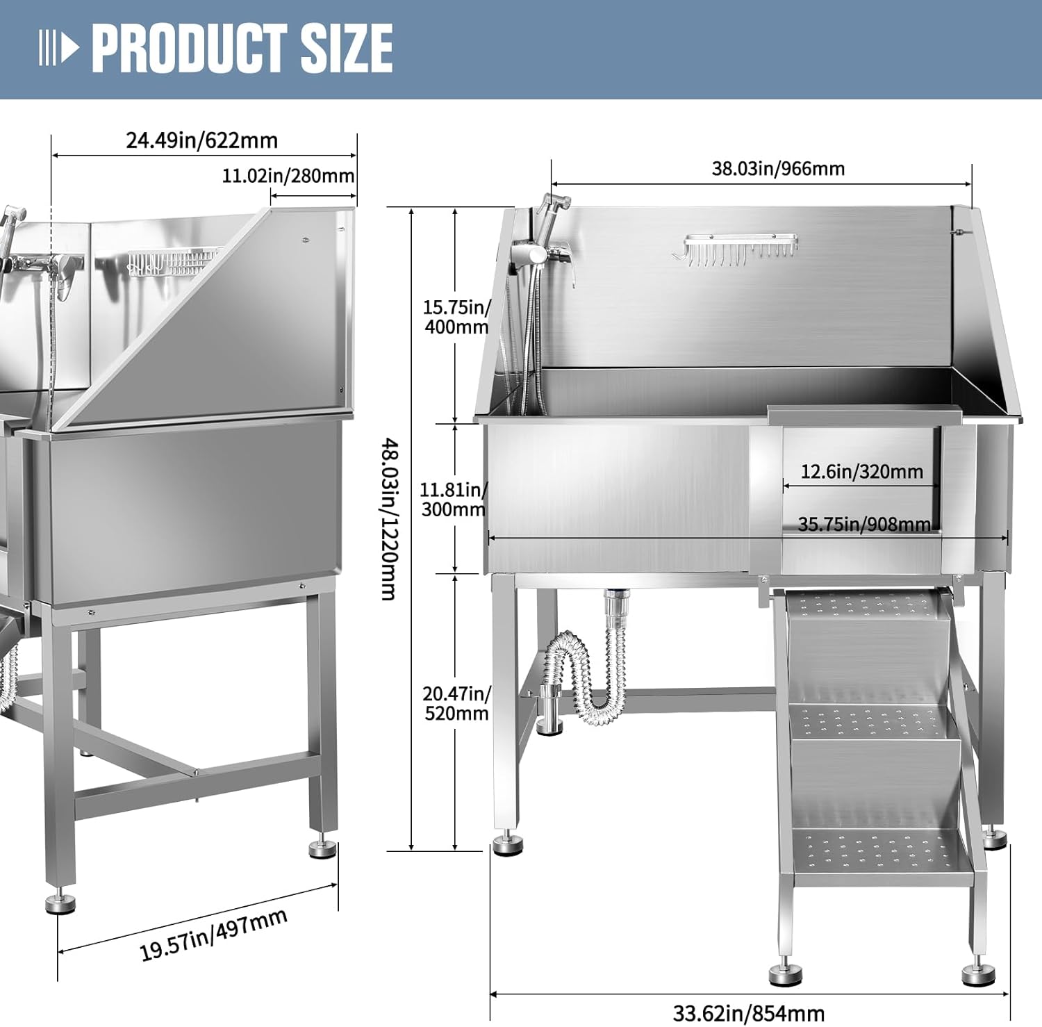 38" Pet Dog Bathing Station W/Ramp, Professional Stainless Steel Dog Grooming Tub W/Floor Grate, Faucet, Dog Bathtub for Large,Medium, Small Pets, Washing Sink for Home,R-RAMP