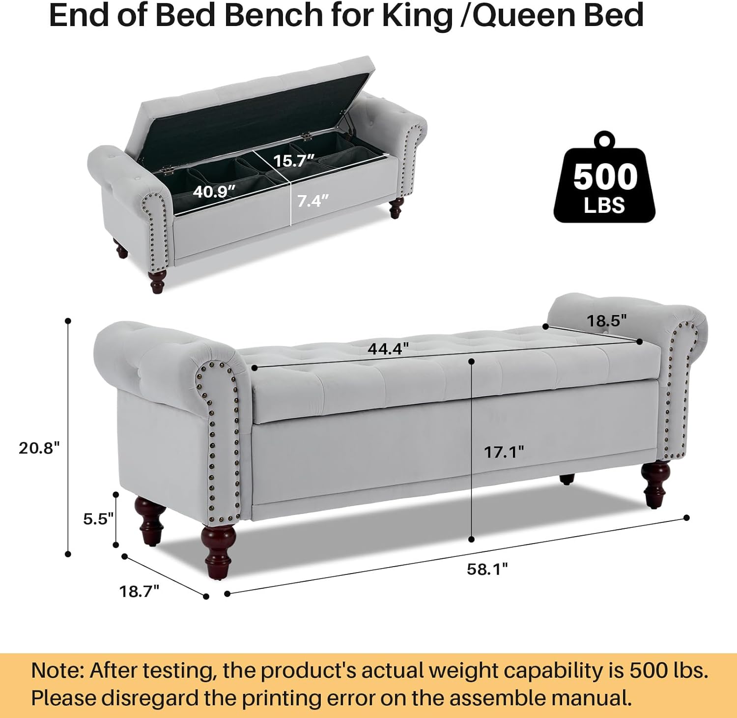 • EASY ASSEMBLY: The This storage bed bench overall size is 58.1" W x 18.7"D x 20.8" H. The cushioned bench is pre-assembled 80% and will come with a manual and installation tools to assemble it, it's simple and convenient.