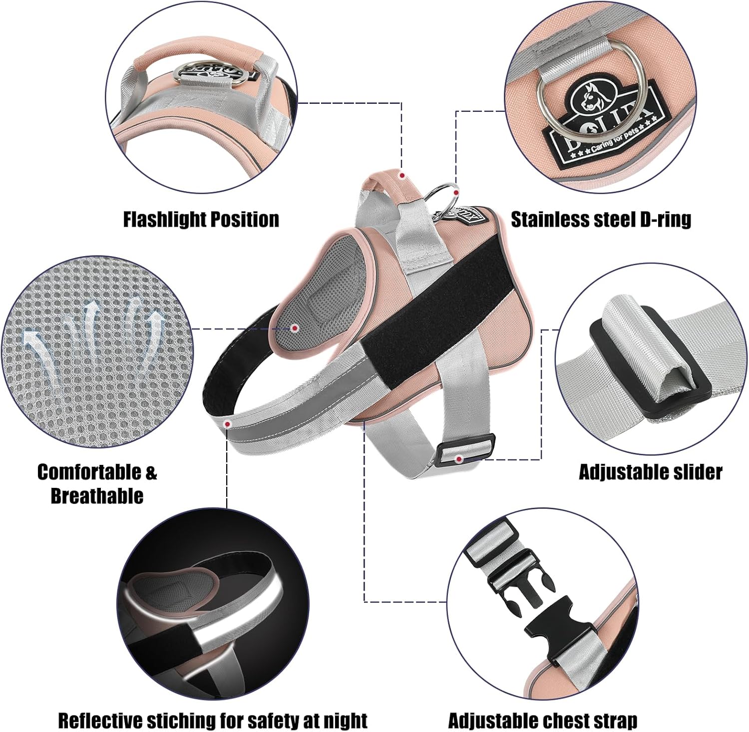 • STURDY HANDLE: The adjustable dog harness with rugged nylon handle further enhances your distance from the dog and is more intimate with each other. Easy on dog harness is also the best partner for dogs and is easy to control your dog.