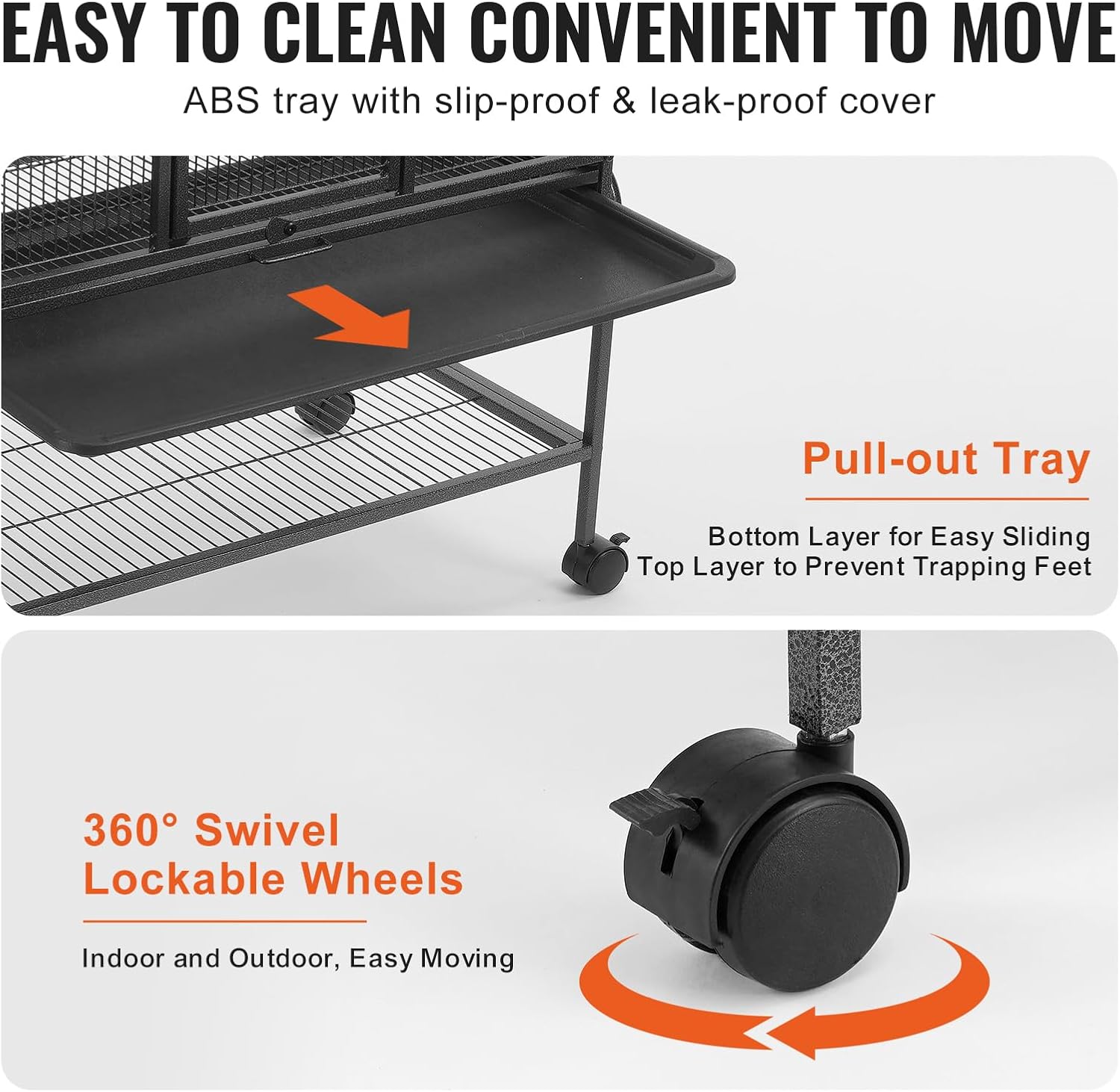 • Easy to Move and Store: Our metal rolling pet cage comes with lockable rolling wheels, allowing easily move your pets from indoors to outdoors, letting them enjoy sunlight and nature. Additionally, there's a large storage shelf above the wheels for keeping pet supplies organized and saving space.