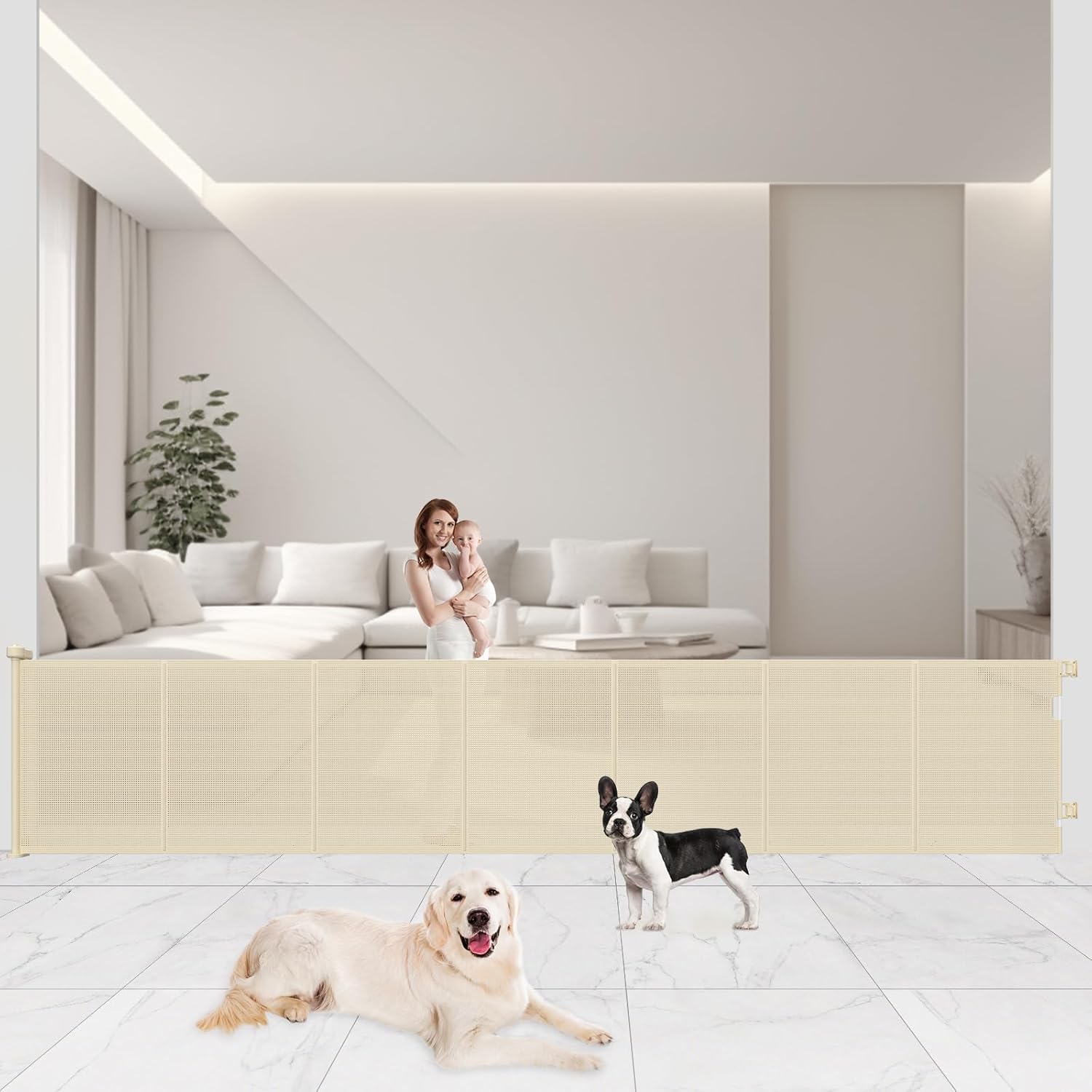 • 120" Extra Wide Retractable Design: Extend our retractable baby gate up to 120" wide, with 41" heightened gates preventing pets from jumping out. Designed to save space, this dog gate is convenient when needed and easily tucked away out of sight when not in use. Note: Please ensure the installation height is above 41" before purchasing