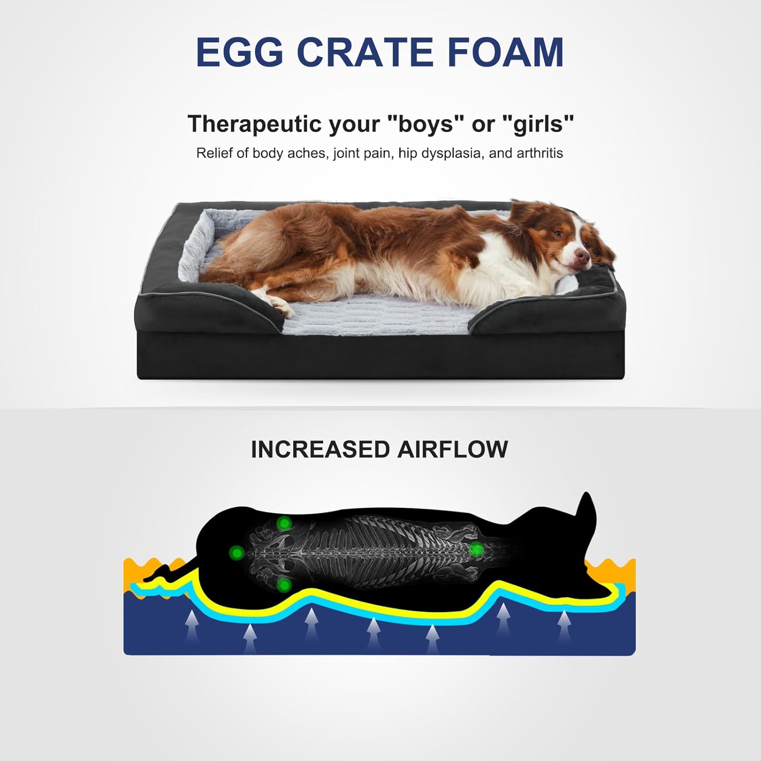• Large Dog BedOrthopedic Support: Our orthopedic dog sofa is designed to give your pet support for a comfortable deep sleep. High-density egg-crate foam helps distribute weight evenly and provides the perfect amount of pressure relief and joint support.