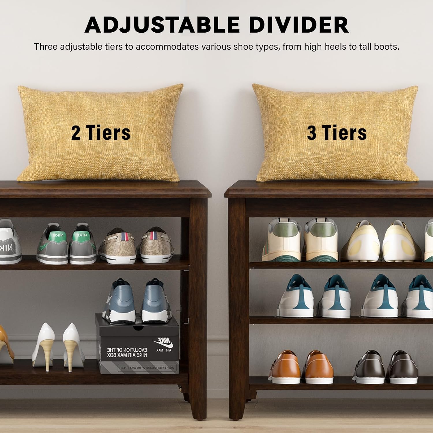 Shoe Bench Storage Rubberwood, Entryway Bench with 3-Tiers Height Adjustable, Shoe Rack Front Door Entrance Organizer for Hallway Living Room, Mudrooms, Walnut,31.5"