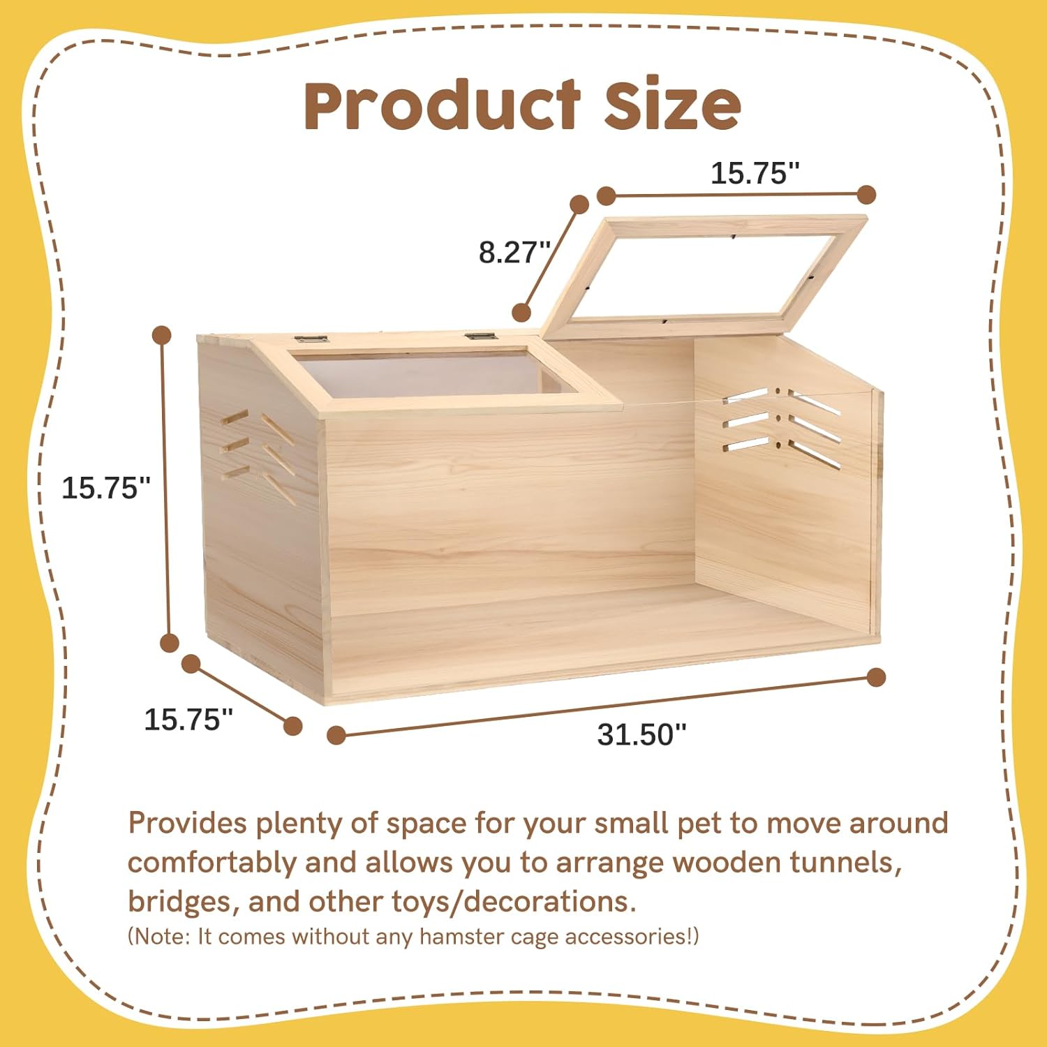 • Generous Space for Exploration --- This large wooden hamster cage measures 31.5" L x 15.7" W x 15.7" H, offering plenty of room for your small pets to roam and play. The spacious design encourages natural behaviors, ensuring that hamsters, gerbils, and other small animals have a comfortable and stimulating environment for their well-being.