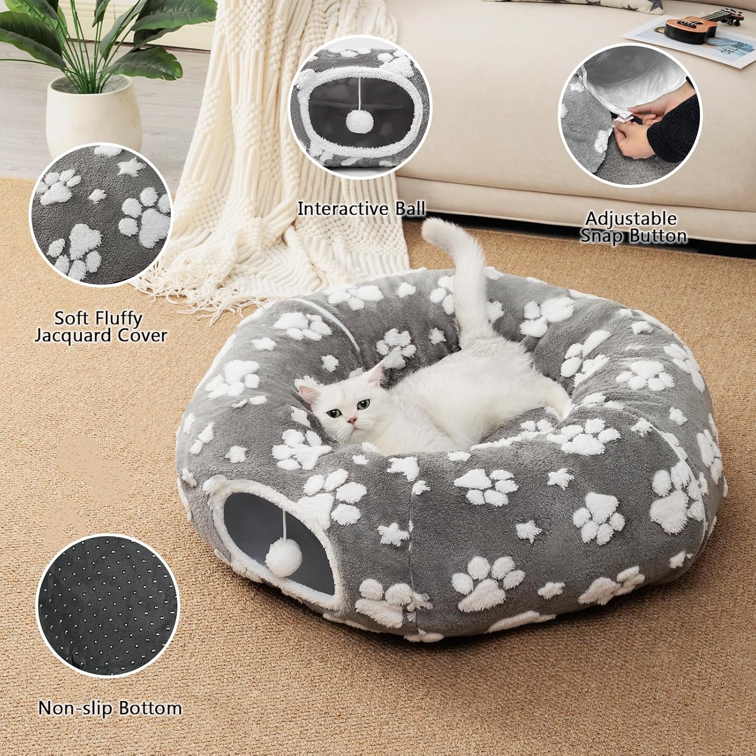 - Easy to Assemble and Care: The design of this donut cat tunnel bed takes into account your convenience, making it easy to assemble and quick to store. The inner cushion bed is removeable, hand washable and easy to clean. In addition, the non-slip bottom keeps the tunnel safe in space, creating a stable and comfortable environment to your pets to play and rest