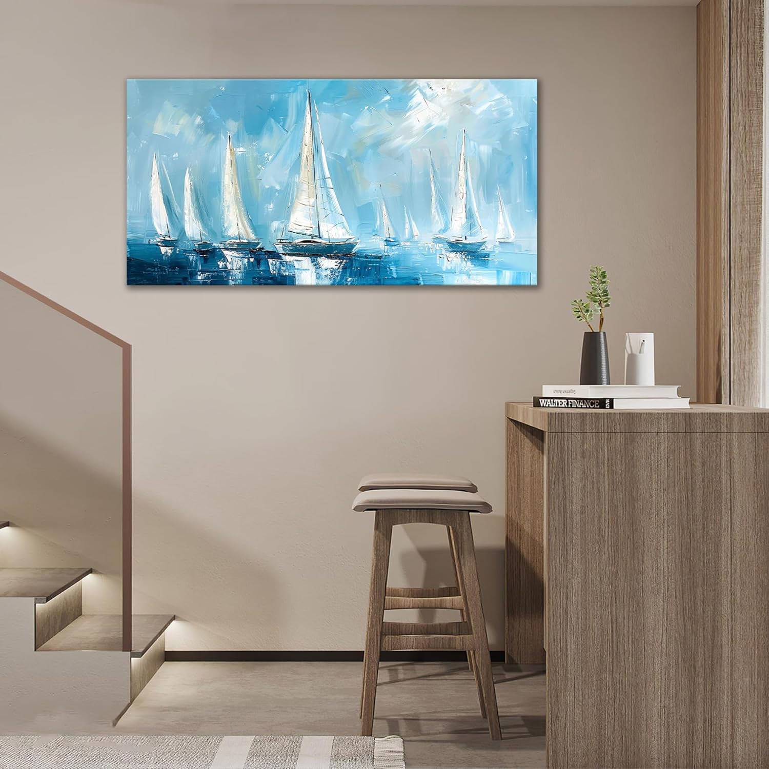 Large Blue and White Sailboat Wall Art Nautical Sails Canvas Living Room Ocean Pictures Framed Prints Oversize Wall Decor Painting Artwork for Bedroom Dining Office Home 60"x30"