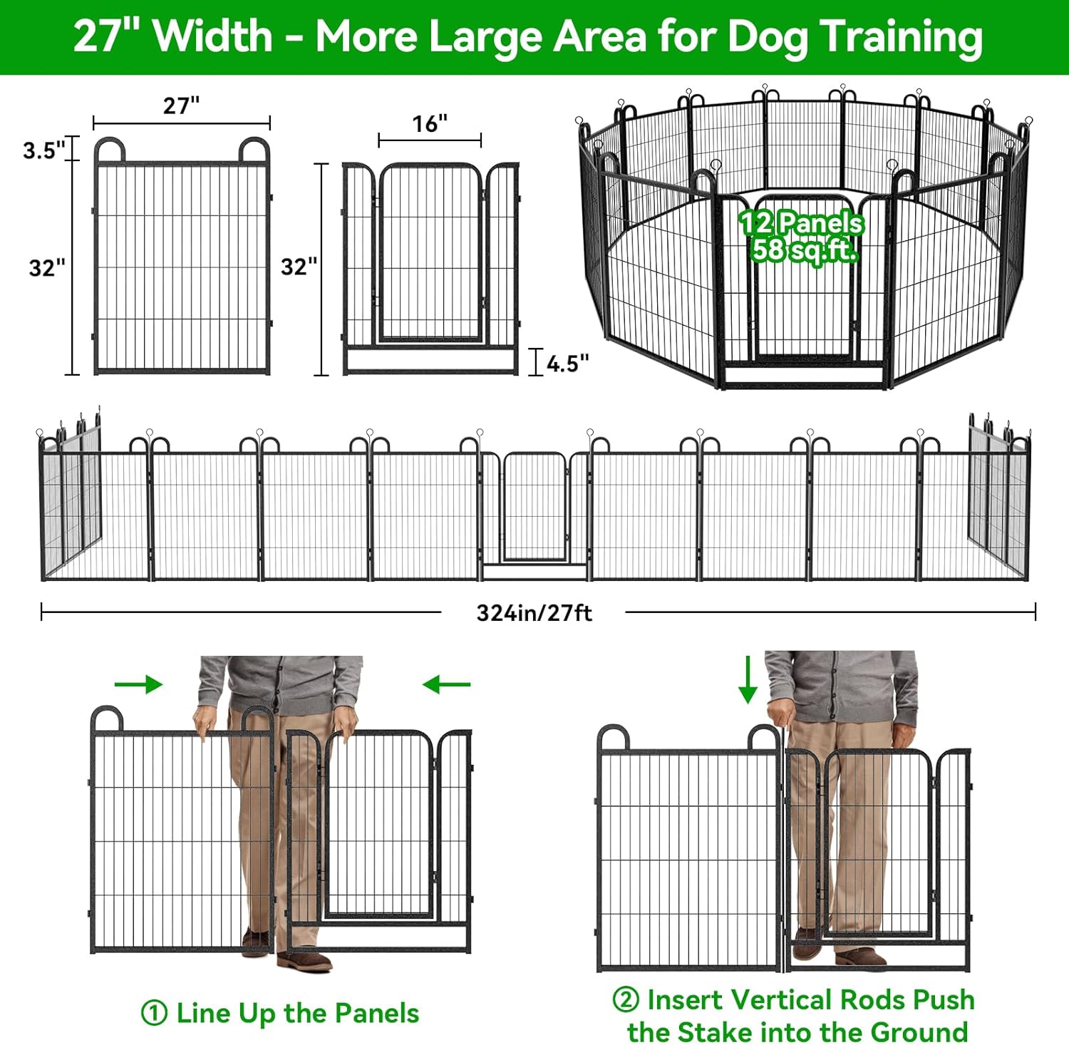 Dog Playpen Outdoor 12 Panels Heavy Duty Dog Fence 32" Height Anti-Rust with Doors Portable for RV Camping Yard, Total 27FT, 58 Sq.ft, Snowy Black
