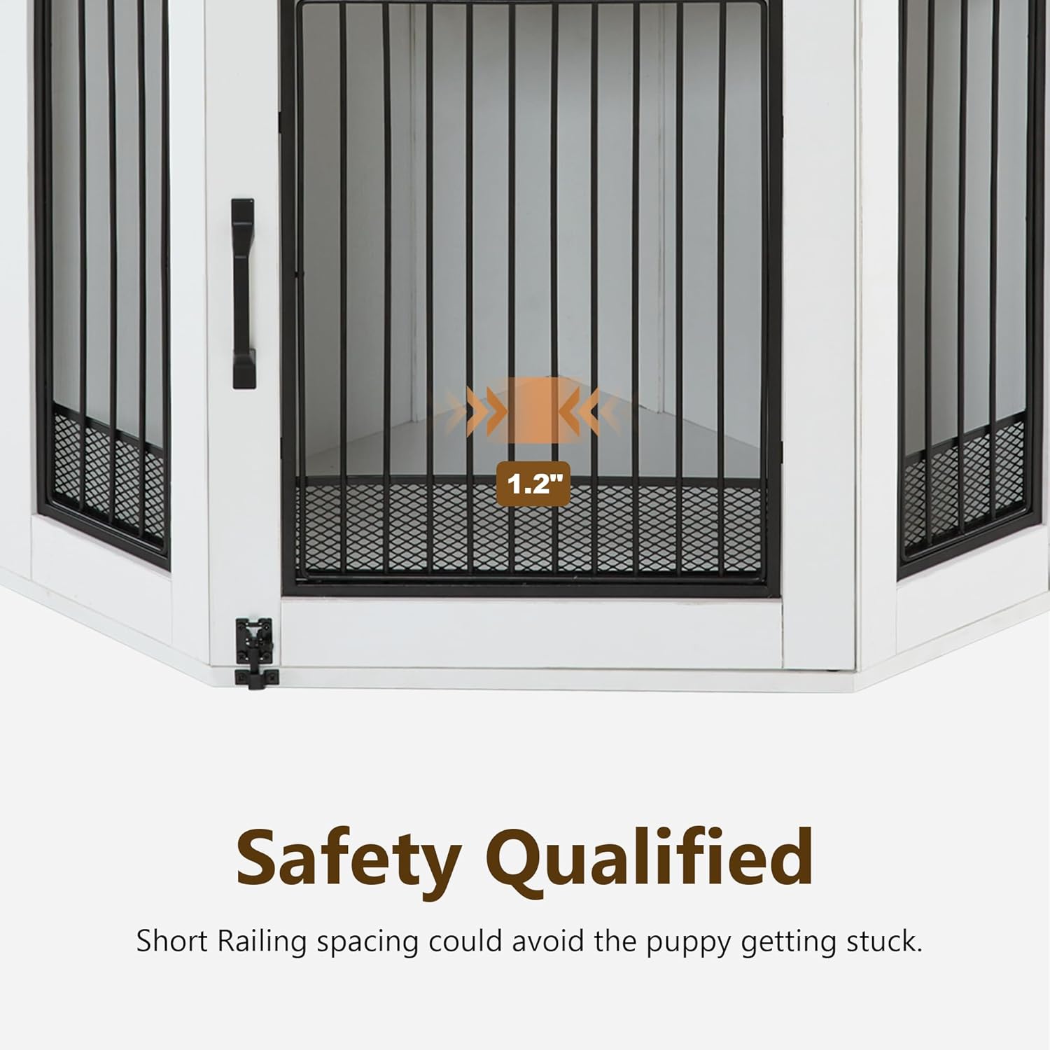 • Safety Protection: The distance between pet kennel bars is 1.2" to prevent the puppy from getting stuck. Anti-tip straps and non-slip pads could avoid the wooden dog house topple.