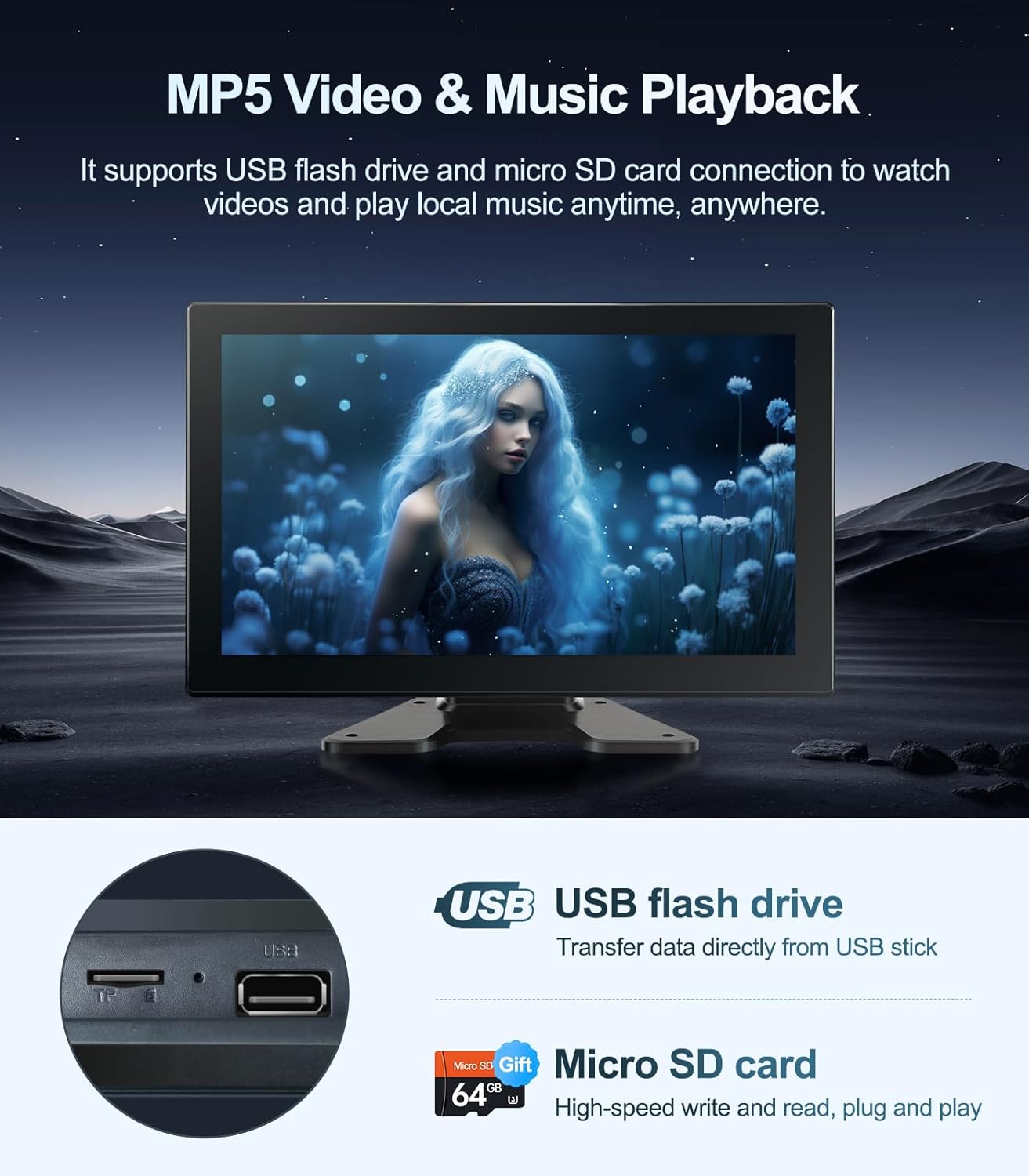 - ใBluetooth & Entertainmentใ: The dash cam monitor is equipped with Bluetooth 5.0 and USB 2.0 ports, supports Bluetooth connection, USB flash drive devices to play videos and music, and comes with an extra 64GB SD Card to meet your storage needs, making your journey more relaxing and fun.