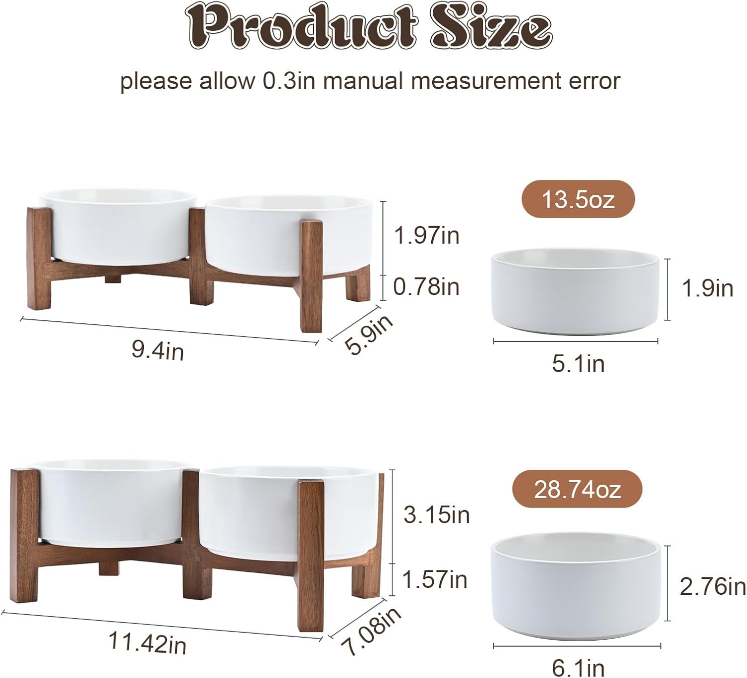 SPUNKYJUNKY Ceramic Dog Bowls with Acacia Wood Stand - Raised Dog Food and Water Bowl Set for Small Dogs (13.52 OZ, White)