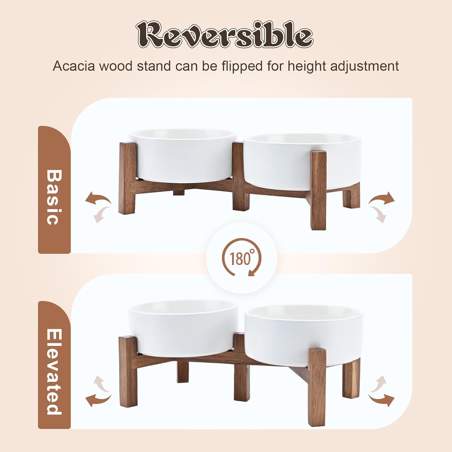 • UPGRADED ACACIA WOOD SHELF: Compared to the usual wood stand, this feeding bowl uses higher quality acacia wood, which not only enhances the overall stability and durability, but also the natural wood grain and warm tone of the wood stand can beautify the home space. The acacia wood stand has better durability and maintains a stable temperament even in humid environments