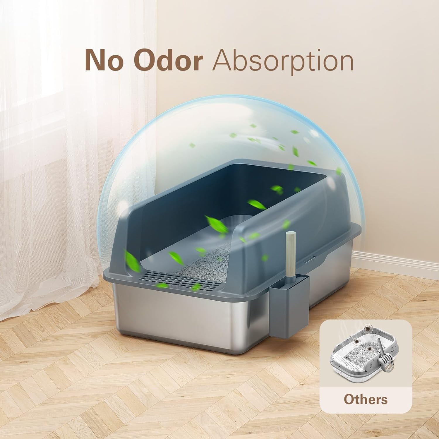 - ใEasy Cleaning for Odor-free Spaceใ: Nonstick surface of the litter box with lid makes cleaning a piece of cake, as waste slides out effortlessly with a quick rinse of water. Unlike plastic litter box, the stainless steel steel box does not absorb stains or odors, maintaining a fresh and hygienic environment for your cat.