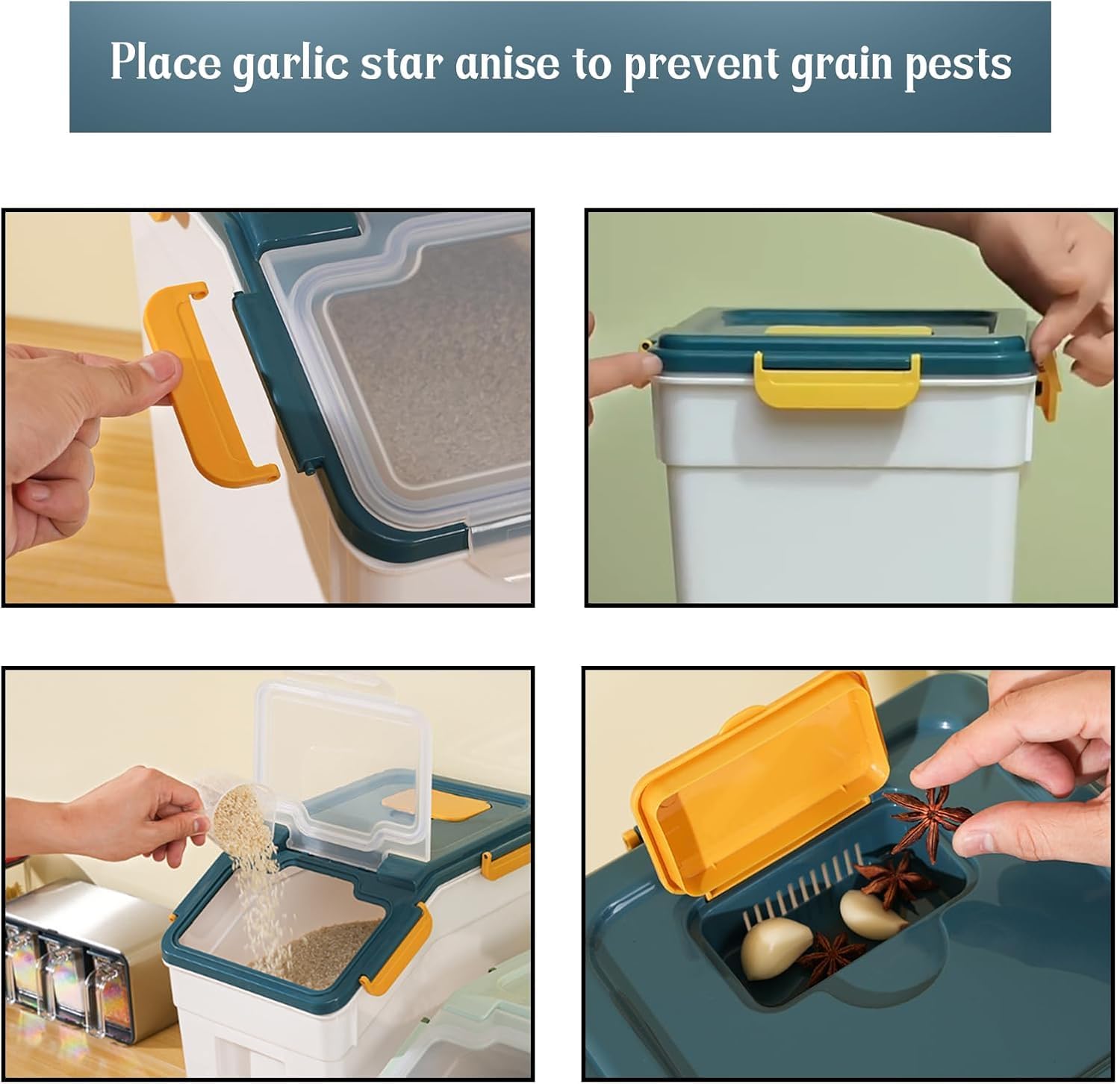 • Multi-purpose rice storage container is a great way to store any type of food and keep it safe and dry.The airtight food container it is suitable for storing flour, grains, cereal, sugar, rice, nuts, beans, snack, coffee, tea, bread, corn, pasta, herbs, pet food, soybeans, dry goods, etc.